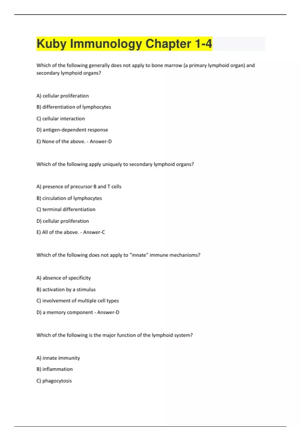 Which of the following generally does not apply to bone marrow (a primary lymphoid organ) and secondary lymphoid organs? A) cellular proliferation B) differentiation of lymphocytes C) cellular interaction D) antigen-dependent response E) None of the above. - Answer-D Which of the following apply uniquely to secondary lymphoid organs? A) presence of precursor B and T cells B) circulation of lymphocytes C) terminal differentiation D) cellular proliferation E) All of the above. - Answer-C Which of the following does not apply to "innate" immune mechanisms? A) absence of specificity B) activation by a stimulus C) involvement of multiple cell types D) a memory component - Answer-D Which of the following is the major function of the lymphoid system? A) innate immunity B) inflammation C) phagocytosisD) acquired immunity E) None of the above. - Answer-D