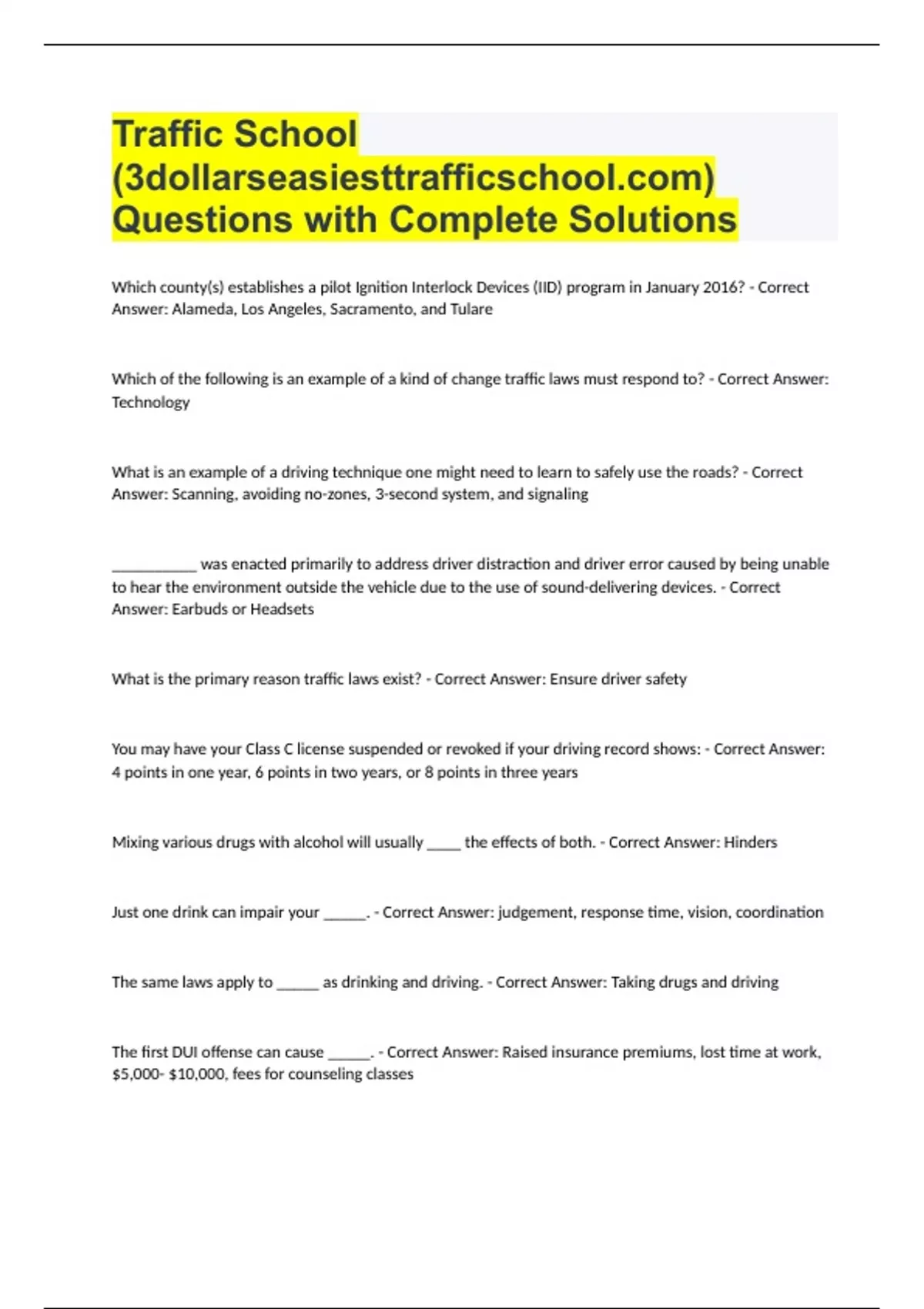 Traffic School (3dollarseasiesttrafficschool.com) Questions with Complete Solutions