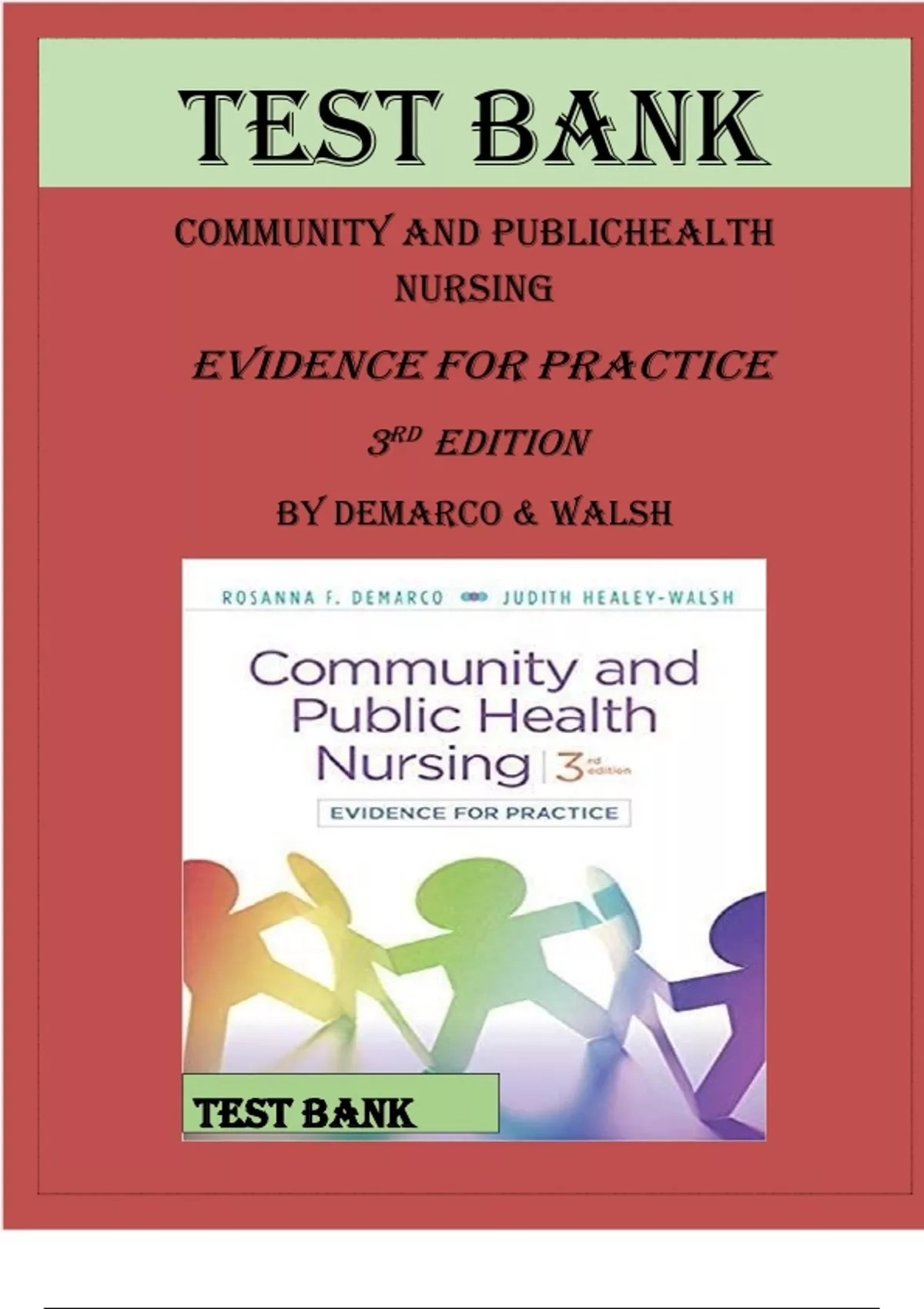 TEST BANK FOR COMMUNITY AND PUBLIC HEALTH NURSING Evidence for Practice 3RD EDITION BY ROSANNA DEMARCO & JUDITH HEALEY-WALSH Latest Verified Review 2024 Practice Questions and Answers for Exam Preparation, 100% Correct with Explanations, Highly Recommended, Download to Score A+ TEST BANK: Community and Public Health Nursing 3rd Edition DeMarco & Walsh Contents: Chapter 1: Public Health Nursing: Present, Past, and Future Chapter 2: Public Health Systems Chapter 3: Health Policy, Politics, and Reform Chapter 4: Global Health: A Community Perspective Chapter 5: Frameworks for Health Promotion, Disease Prevention, and Risk Reduction Chapter 6: Epidemiology: The Science of Prevention Chapter 7: Describing Health Conditions: Understanding and Using Rates Chapter 8: Gathering Evidence for Public Health Practice Chapter 9: Planning for Community Change Chapter 10: Cultural Competence: Awareness, Sensitivity, and Respect Chapter 11: Community Assessment Chapter 12: Care Management, Case Management, and Home Healthcare Chapter 13: Family Assessment Chapter 14: Risk of Infectious and Communicable Diseases Chapter 15: Emerging Infectious Diseases Chapter 16: Violence and Abuse Chapter 17: Substance Use Chapter 18: Underserved Populations Chapter 19: Environmental Health Chapter 20: Community Preparedness: Disaster and Terrorism Chapter 21: Community Mental Health Chapter 22: School Health Chapter 23: Faith-Oriented Communities and Health Ministries in Faith Communities Chapter 24: Palliative and End-of-Life Care Chapter 25: Occupational Health Nursing