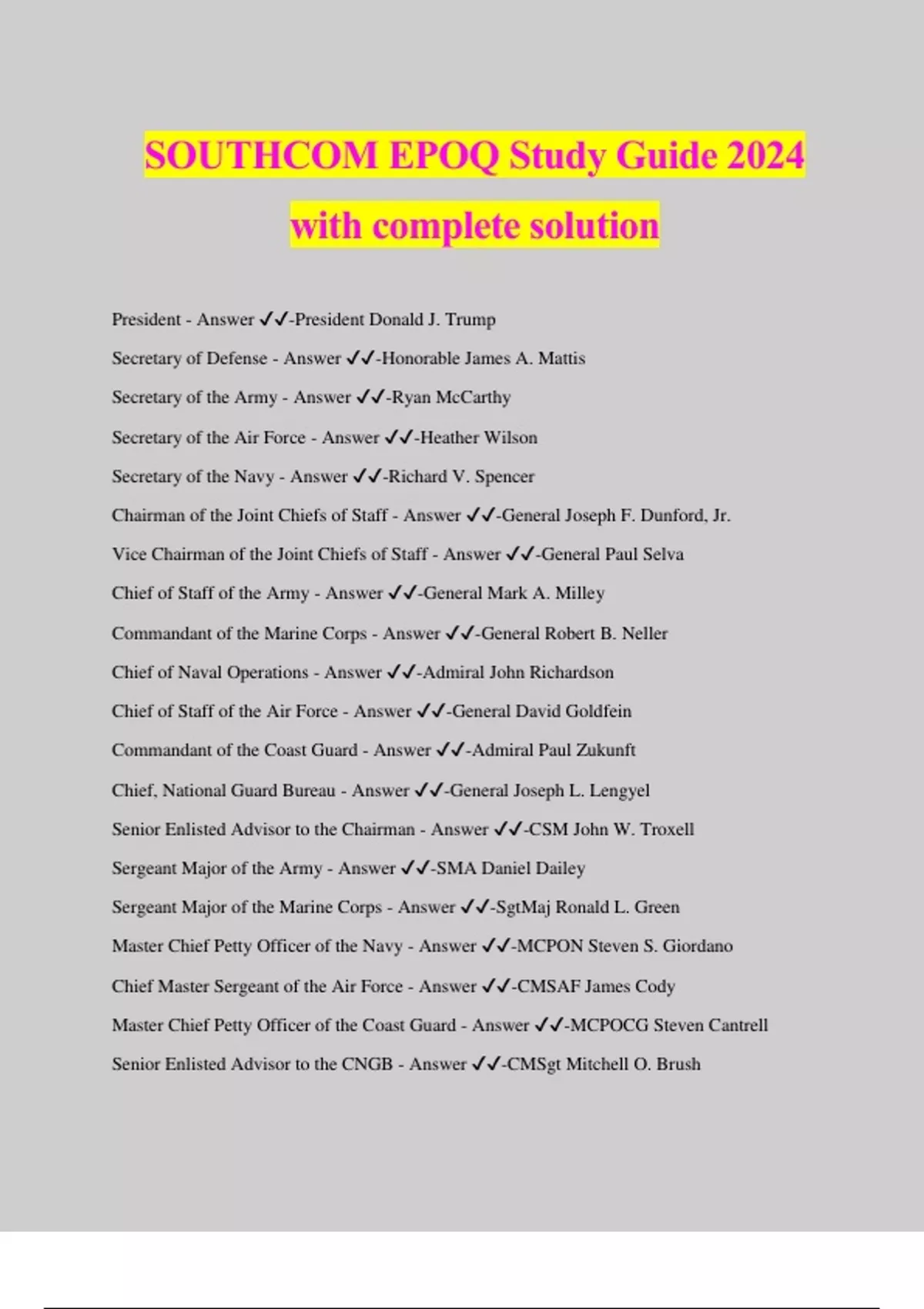 SOUTHCOM EPOQ Study Guide 2024 with complete solution President - Answer ️️ -President Donald J. Trump Secretary of Defense - Answer ️️ -Honorable James A. Mattis Secretary of the Army - Answer ️️ -Ryan McCarthy Secretary of the Air Force - Answer ️️ -Heather Wilson Secretary of the Navy - Answer ️️ -Richard V. Spencer Chairman of the Joint Chiefs of Staff - Answer ️️ -General Joseph F. Dunford, Jr. Vice Chairman of the Joint Chiefs of Staff - Answer ️️ -General Paul Selva Chief of Staff of the Army - Answer ️️ -General Mark A. Milley Commandant of the Marine Corps - Answer ️️ -General Robert B. Neller Chief of Naval Operations - Answer ️️ -Admiral John Richardson Chief of Staff of the Air Force - Answer ️️ -General David Goldfein Commandant of the Coast Guard - Answer ️️ -Admiral Paul Zukunft Chief, National Guard Bureau - Answer ️️ -General Joseph L. Lengyel Senior Enlisted Advisor to the Chairman - Answer ️️ -CSM John W. Troxell Sergeant Major of the Army - Answer ️️ -SMA Daniel Dailey Sergeant Major of the Marine Corps - Answer ️️ -SgtMaj Ronald L. Green Master Chief Petty Officer of the Navy - Answer ️️ -MCPON Steven S. Giordano Chief Master Sergeant of the Air Force - Answer ️️ -CMSAF James Cody Master Chief Petty Officer of the Coast Guard - Answer ️️ -MCPOCG Steven Cantrell Senior Enlisted Advisor to the CNGB - Answer ️️ -CMSgt Mitchell O. Brush USSOUTHCOM Commander - Answer ️️ -ADM Kurt W. Tidd is SOUTHCOM's 23rd commander. He assumed command Jan. 14, 2016 US Army Garrison-Miami HQ Commandant - Answer ️️ -COL Jose E. Solis USSOUTHCOM Command Senior Enlisted Leader - Answer ️️ -SgtMaj Bryan K. Zickefoose US Army Garrison-Miami HQ First Sergeant - Answer ️️ -1SG Danny Gomes US Army Garrison-Miami HQ SEL - Answer ️️ -CMSgt E. Donald Bailey Air Force Element SEL - Answer ️️ -CMSgt Donald E. Bailey Army Element SEL - Answer ️️ -SGM Jose L. Bermudez Marine Corps Element SEL - Answer ️️ -GySgt Christopher Q. Battle Navy Element SEL - Answer ️️ -MCPO Nathaniel G. Karlan USANEC - Answer ️️ -1SG Tawaina