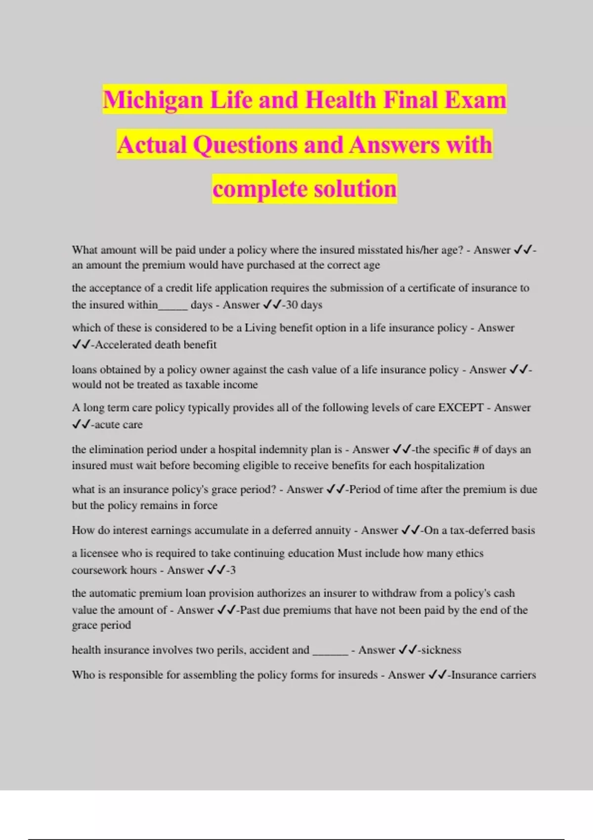 Michigan Life and Health Final Exam Actual Questions and Answers with complete solution