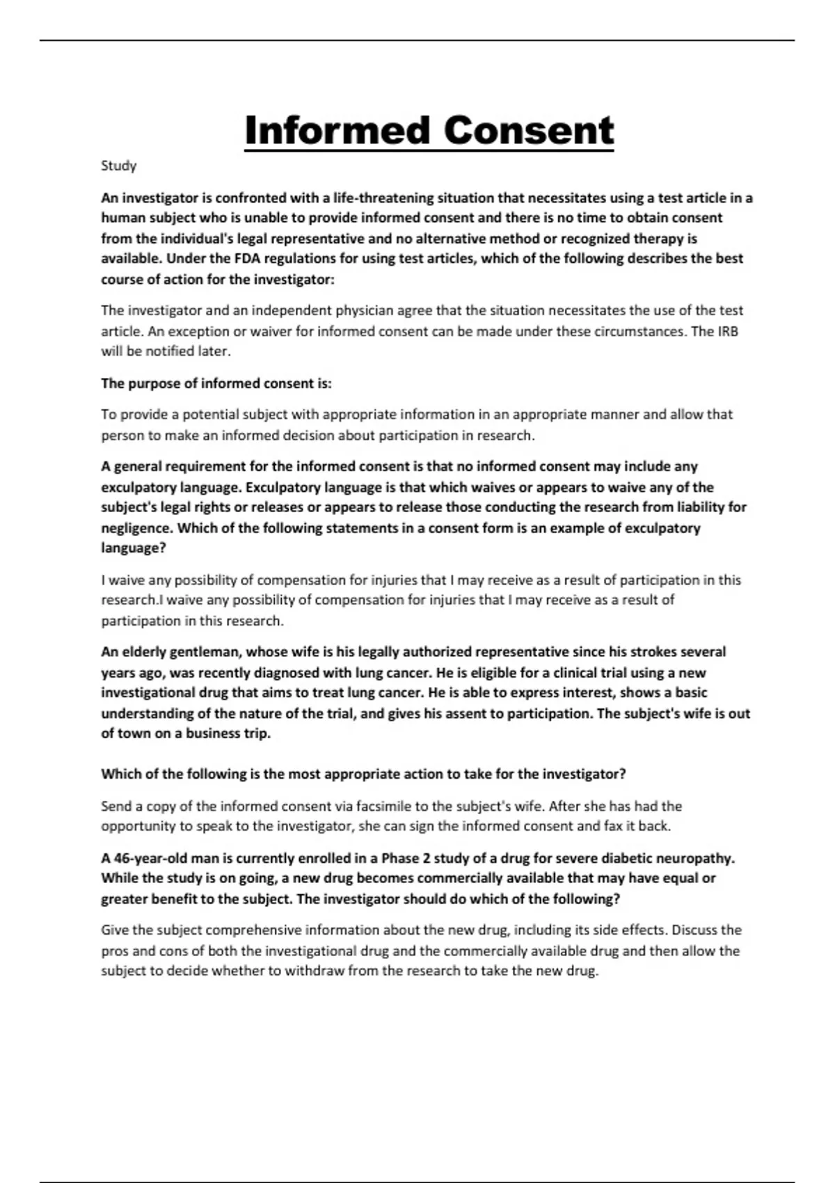 An investigator is confronted with a life-threatening situation that necessitates using a test article in a human subject who is unable to provide informed consent and there is no time to obtain consent from the individual's legal representative and no alternative method or recognized therapy is available. Under the FDA regulations for using test articles, which of the following describes the best course of action for the investigator: The investigator and an independent physician agree that the situation necessitates the use of the test article. An exception or waiver for informed consent can be made under these circumstances. The IRB will be notified later. The purpose of informed consent is: To provide a potential subject with appropriate information in an appropriate manner and allow that person to make an informed decision about participation in research. A general requirement for the informed consent is that no informed consent may include any exculpatory language. Exculpatory language is that which waives or appears to waive any of the subject's legal rights or releases or appears to release those conducting the research from liability for negligence. Which of the following statements in a consent form is an example of exculpatory language? I waive any possibility of compensation for injuries that I may receive as a result of participation in this research.I waive any possibility of compensation for injuries that I may receive as a result of participation in this research. An elderly gentleman, whose wife is his legally authorized representative since his strokes several years ago, was recently diagnosed with lung cancer. He is eligible for a clinical trial using a new investigational drug that aims to treat lung cancer. He is able to express interest, shows a basic understanding of the nature of the trial, and gives his assent to participation. The subject's wife is out of town on a business trip. Which of the following is the most appropriate action to take for the investigator? Send a copy of the informed consent via facsimile to the subject's wife. After she has had the opportunity to speak to the investigator, she can sign the informed consent and fax it back. A 46-year-old man is currently enrolled in a Phase 2 study of a drug for severe diabetic neuropathy. While the study is on going, a new drug becomes commercially available that may have equal or greater benefit to the subject. The investigator should do which of the following? Give the subject comprehensive information about the new drug, including its side effects. Discuss the pros and cons of both the investigational drug and the commercially available drug and then allow the subject to decide whether to withdraw from the research to take the new drug.