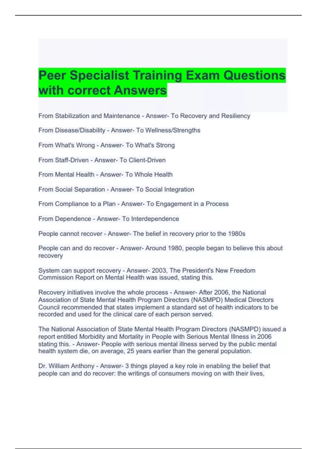 Peer Specialist Training Exam Questions with correct Answers