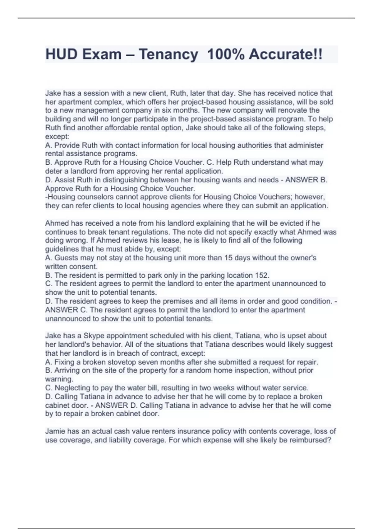 Jake has a session with a new client, Ruth, later that day. She has received notice that her apartment complex, which offers her project-based housing assistance, will be sold to a new management company in six months. The new company will renovate the building and will no longer participate in the project-based assistance program. To help Ruth find another affordable rental option, Jake should take all of the following steps, except: A. Provide Ruth with contact information for local housing authorities that administer rental assistance programs. B. Approve Ruth for a Housing Choice Voucher. C. Help Ruth understand what may deter a landlord from approving her rental application. D. Assist Ruth in distinguishing between her housing wants and needs - ANSWER B. Approve Ruth for a Housing Choice Voucher. -Housing counselors cannot approve clients for Housing Choice Vouchers; however, they can refer clients to local housing agencies where they can submit an application. Ahmed has received a note from his landlord explaining that he will be evicted if he continues to break tenant regulations. The note did not specify exactly what Ahmed was doing wrong. If Ahmed reviews his lease, he is likely to find all of the following guidelines that he must abide by, except: A. Guests may not stay at the housing unit more than 15 days without the owner's written consent. B. The resident is permitted to park only in the parking location 152. C. The resident agrees to permit the landlord to enter the apartment unannounced to show the unit to potential tenants. D. The resident agrees to keep the premises and all items in order and good condition. - ANSWER C. The resident agrees to permit the landlord to enter the apartment unannounced to show the unit to potential tenants. Jake has a Skype appointment scheduled with his client, Tatiana, who is upset about her landlord's behavior. All of the situations that Tatiana describes would likely suggest that her landlord is in breach of contract, except: A. Fixing a broken stovetop seven months after she submitted a request for repair. B. Arriving on the site of the property for a random home inspection, without prior warning. C. Neglecting to pay the water bill, resulting in two weeks without water service. D. Calling Tatiana in advance to advise her that he will come by to replace a broken cabinet door. - ANSWER D. Calling Tatiana in advance to advise her that he will come by to repair a broken cabinet door. Jamie has an actual cash value renters insurance policy with contents coverage, loss of use coverage, and liability coverage. For which expense will she likely be reimbursed? A. The cost of rebuilding the living room, which was destroyed by fire. B. The entire cost of purchasing a brand new bedroom set damaged by a pipe burst and subsequent water damage. C. Expenses associated with purchasing replacement materials for the artwork she sells through an online vendor. D. Expenses for legal fees when Jamie is sued by her daughter's classmate who injured himself when he tripped over clutter at Jamie's apartment. - ANSWER D. Expenses for legal fees when Jamie is sued by her daughter's classmate who injured himself when he tripped over clutter at Jamie's apartment. Jake has clients in all of the following situations. Which client would Jake likely recommend contact an emergency rent assistance program? A. The client wants to quit working to return to college and will need help paying for rent while in school. B. The client cannot afford a rental in the area and needs a housing subsidy to obtain a rental. C. The client has been living with a roommate who suddenly moves and does not leave his portion of the month's rent. D. The client has been notified that her rent will increase by $200 per month if she decides to remain in her apartment after her lease comes up for renewal in four months. She cannot afford to pay an additional $200 a month. - ANSWER C. The client has been living with a roommate who suddenly moves and does not leave his portion of the month's rent. -If the roommate did not leave his portion of the rent, the client may not have enough money to pay the full amount of rent. If he does not pay in full, he may be threatened by eviction. Emergency rent assistance programs are likely to assist in this situation. A client with two cats received a cure or quit notice. Which following action would a housing counselor likely recommend to someone in this situation? A. Send an "answer" to the court explaining that the animal is not considered a pet. B. Find another home for the animal within the time frame outlined in the notice. C. Consult with a housing counselor to find housing in preparation for the eviction. D. Hide the cat at a friend's house for a few days or until things cool off with the landlord. - ANSWER B. Find another home for the animal within the time frame outlined in the notice. All of the following clients are facing challenges with rental housing. Which client would Jake likely refer to an emergency shelter? A. The client had