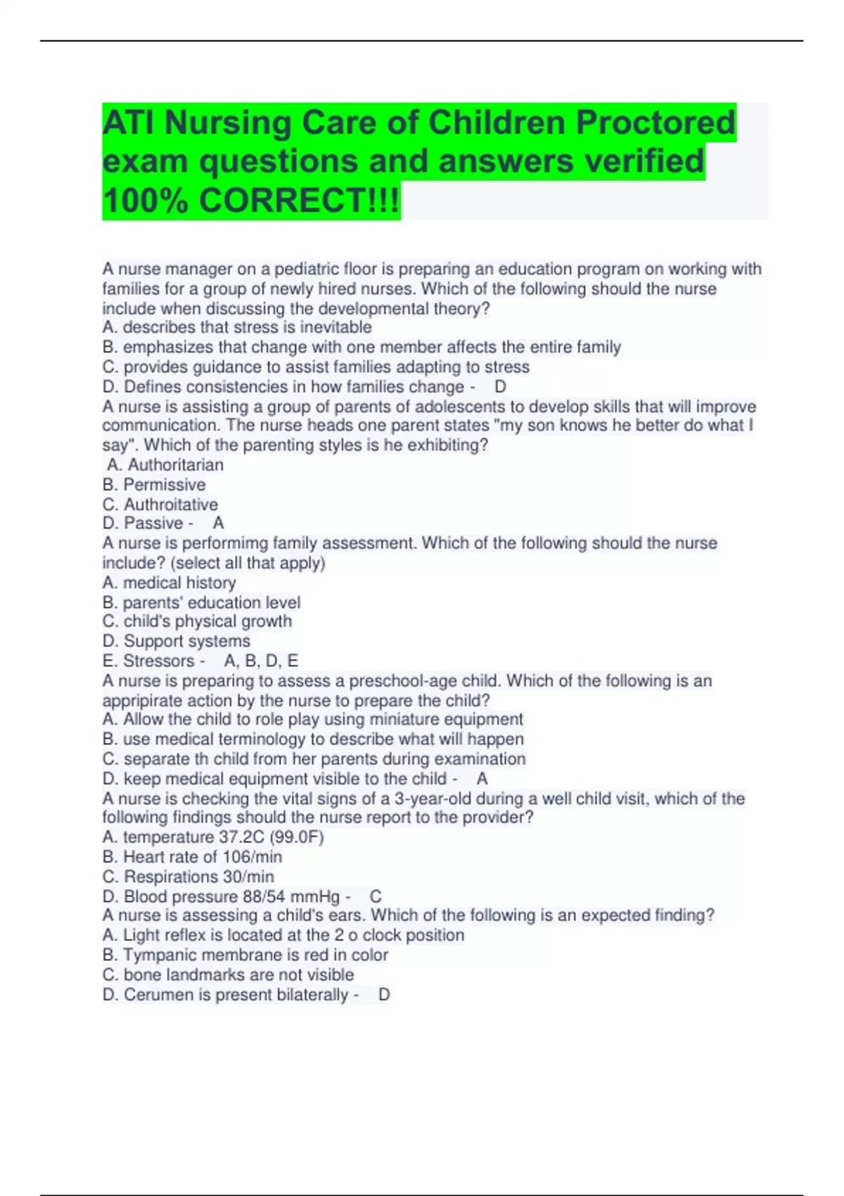 ATI Nursing Care of Children Proctored exam questions and answers verified 100% CORRECT!!! A nurse manager on a pediatric floor is preparing an education program on working with families for a group of newly hired nurses. Which of the following should the nurse include when discussing the developmental theory? A. describes that stress is inevitable B. emphasizes that change with one member affects the entire family C. provides guidance to assist families adapting to stress D. Defines consistencies in how families change - D A nurse is assisting a group of parents of adolescents to develop skills that will improve communication. The nurse heads one parent states "my son knows he better do what I say". Which of the parenting styles is he exhibiting? A. Authoritarian B. Permissive C. Authroitative D. Passive - A A nurse is performimg family assessment. Which of the following should the nurse include? (select all that apply) A. medical history B. parents' education level C. child's physical growth D. Support systems E. Stressors - A, B, D, E A nurse is preparing to assess a preschool-age child. Which of the following is an appripirate action by the nurse to prepare the child? A. Allow the child to role play using miniature equipment B. use medical terminology to describe what will happen C. separate th child from her parents during examination D. keep medical equipment visible to the child - A A nurse is checking the vital signs of a 3-year-old during a well child visit, which of the following findings should the nurse report to the provider? A. temperature 37.2C (99.0F) B. Heart rate of 106/min C. Respirations 30/min D. Blood pressure 88/54 mmHg - C A nurse is assessing a child's ears. Which of the following is an expected finding? A. Light reflex is located at the 2 o clock position B. Tympanic membrane is red in color C. bone landmarks are not visible D. Cerumen is present bilaterally - D A nurse is assessing a 6-month-old infant. Which of the following reflexes shoudl the infant exhibit? A. Moro B. Plantar grasp C. Stepping D. Tonic necl - B A nurse is performing a neurological assessment on an adolescent. Which of the following is an appropriate reaction by the adolescent when the nurse checks the trigeminal cranial nerve? (select all that apply) A. clencing the teeth together tightly B. recognizing a sour tast C. identifying smells through each nostril D. detecing facial touches when eyes closed E. Looking down and in with the eyes - A, D A nurse is assessing a 12 months old infant during a well-child visit. Which of the following findings should the nurse report to the provider? A. closed anterior fontanel B. eruption of 6 teeth C. Birth weight doubled D. Birth length increased by 50 % - C A nurse is performing a developmental screening of a 10-month old infant. Which of the following fine motor skills should the nurse expect to find? (select all that apply) A. grasp a raddle by the handle B. try building a two-block tower C. use a crude pincer grasp D. Pl