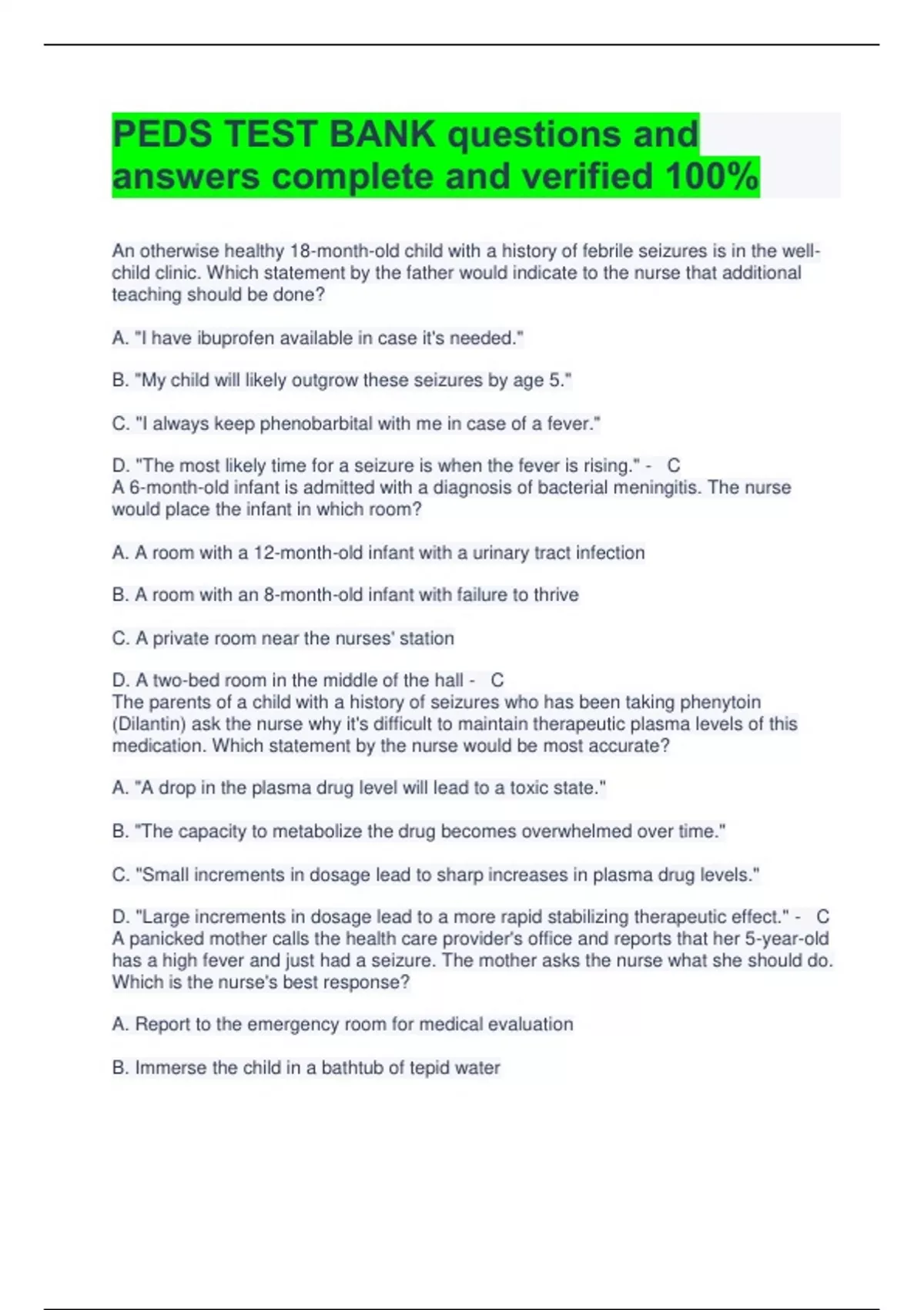 PEDS TEST BANK questions and answers complete and verified 100% An otherwise healthy 18-month-old child with a history of febrile seizures is in the wellchild clinic. Which statement by the father would indicate to the nurse that additional teaching should be done? A. "I have ibuprofen available in case it's needed." B. "My child will likely outgrow these seizures by age 5." C. "I always keep phenobarbital with me in case of a fever." D. "The most likely time for a seizure is when the fever is rising." - C A 6-month-old infant is admitted with a diagnosis of bacterial meningitis. The nurse would place the infant in which room? A. A room with a 12-month-old infant with a urinary tract infection B. A room with an 8-month-old infant with failure to thrive C. A private room near the nurses' station D. A two-bed room in the middle of the hall - C The parents of a child with a history of seizures who has been taking phenytoin (Dilantin) ask the nurse why it's difficult to maintain therapeutic plasma levels of this medication. Which statement by the nurse would be most accurate? A. "A drop in the plasma drug level will lead to a toxic state." B. "The capacity to metabolize the drug becomes overwhelmed over time." C. "Small increments in dosage lead to sharp increases in plasma drug levels." D. "Large increments in dosage lead to a more rapid stabilizing therapeutic effect." - C A panicked mother calls the health care provider's office and reports that her 5-year-old has a high fever and just had a seizure. The mother asks the nurse what she should do. Which is the nurse's best response? A. Report to the emergency room for medical evaluation B. Immerse the child in a bathtub of tepid water C. Administer oral acetaminophen per package directions D. Remove any heavy clothing and cover with a thin sheet - A The nurse is assessing a 7-year-old with a hearing aid. His mother says he is losing his hearing again. Which finding would the nurse identify as contributing to this current complaint? A. Overproduction of cerumen B. Soreness of the outer ear C. History of a normal term birth D. The eardrum responds to a puff of air - A The nurse is taking a health history for a 9-year-old with conjunctivitis. Which statement by the parents leads the nurse to suspect that the child is experiencing allergic conjunctivitis? A. "He recently helped clean the basement. B. "He was exposed to several family members with an infection. C. He just recovered from an upper respiratory infection. D. We have a family history of conjunctivitis. - A The mother of a 12-year-old with Reye syndrome approaches the nurse wanting to know how this happened to her child, saying, "I never give my kids aspirin!" Which response by the nurse would be most appropriate? A. "Sometimes it's hard to tell if a product contains aspirin." B. "Do you think that maybe your child took aspirin on his own?" C. "Don't worry; you're in good hands. We have it under control now." D. "Aspirin in combination with the virus will make the brain swell and the liver fail." - A The nurse is caring for a 3-year-old girl who has just undergone a ventriculostomy. Which of the following would the nurse include in this child's plan of care to manage increased intracranial pressure (ICP)? A. Use pillows to support the child when lying on her side B. Support the parents in starting a ketogenic diet C. Pad the side rails on the bed D. Teach her to do deep breathing techniques - A A nurse is caring for a 3-year-old girl with microcephaly. Which of the following actions is appropriate for the nurse to take? A. Playfully ask the child to touch her nose B. Teach the parents about ventriculoperitoneal (VP) shunts C. Prepare the child for the experience of cranial surgery D. Administer antipyretics as ordered - A The nurse caring for a neonate experiencing seizures asks the charge nurse: "How can I tell if a baby is having a seizure or is just crying for attention?" Which response would be most appropriate? Select all that apply. A. "You will not be able to stop a seizure with gentle restraint." B. "The baby experiencing a seizure will be tachycardic." C. "Stimulating the baby by singing to him will not stop a seizure." D. "There will be no changes in the baby's vital signs with a seizure" E. "The baby will become more active with sensory stimulation with a seizure." - A, B, C An 18-month-old child is admitted with signs of increased intracranial pressure. What should the nurse observe when assessing this patient? A. Numbness of fingers and decreased temperature B. Increased pulse rate and decreased blood pressure C. Increased temperature and decreased respiratory rate D. Decreased level of consciousness and increased respiratory rate - C An 8-year-old child is being treated for tonic-clonic seizures. What should the nurse emphasize when teaching the parents about this disorder? A. The child should maintain an active lifestyle. B. Immediately provide medication if a seizure begins. C. Have the child carry a padded tongue blade with her at all times. D. Ensure quiet time late in the day, when seizure activity is most likely to occur. - A The nurse instructs a hearing-impaired school-age child on to how self-inject a prescribed medication. Which observation indicates to the nurse that additional teaching is required? A. The child pinches the skin together before inserting the needle. B. The child injects the appropriate amount of air into the vial before withdrawing medication. C. The child places the filled syringe and uncapped needle on the bed to open the alcohol wipe. D. The child slowly pushes on th