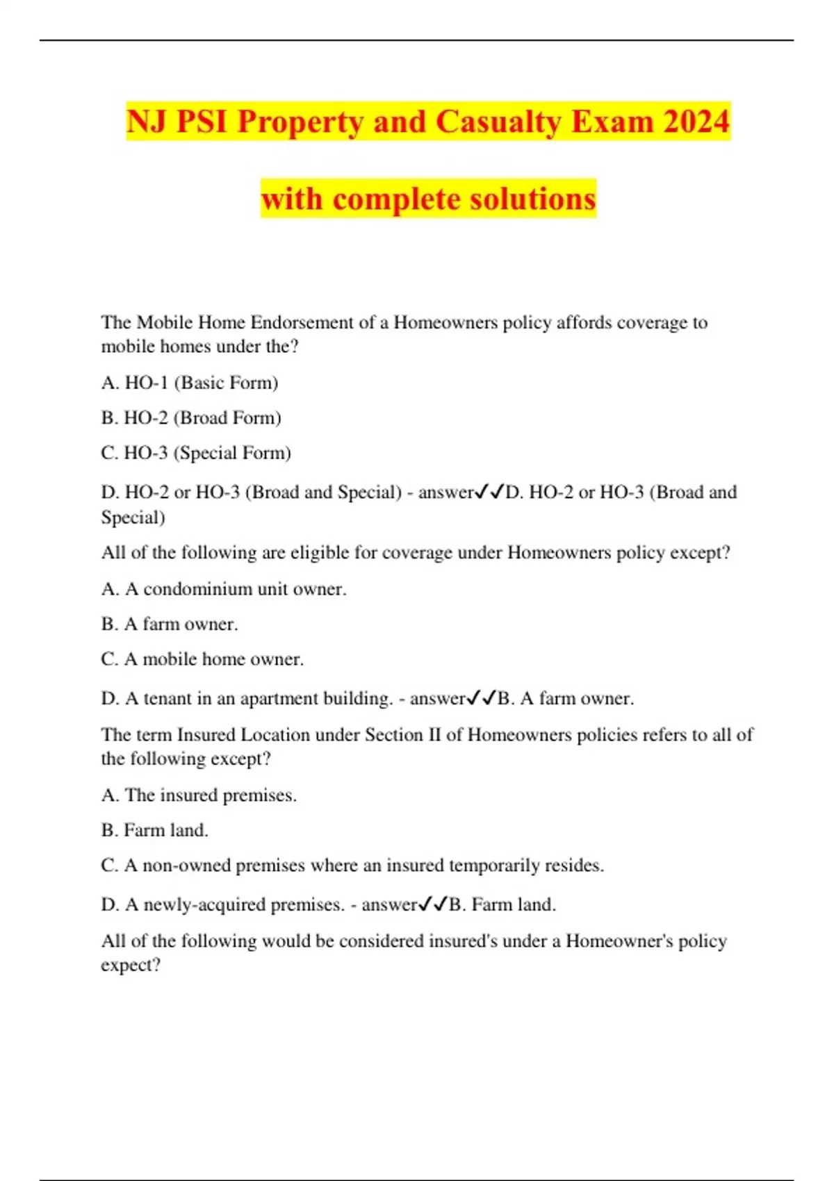 NJ PSI Property and Casualty Exam 2024 with complete solutions The Mobile Home Endorsement of a Homeowners policy affords coverage to mobile homes under the? A. HO-1 (Basic Form) B. HO-2 (Broad Form) C. HO-3 (Special Form) D. HO-2 or HO-3 (Broad and Special) - answerD. HO-2 or HO-3 (Broad and Special) All of the following are eligible for coverage under Homeowners policy except? A. A condominium unit owner. B. A farm owner. C. A mobile home owner. D. A tenant in an apartment building. - answerB. A farm owner. The term Insured Location under Section II of Homeowners policies refers to all of the following except? A. The insured premises. B. Farm land. C. A non-owned premises where an insured temporarily resides. D. A newly-acquired premises. - answerB. Farm land. All of the following would be considered insured's under a Homeowner's policy expect? A. Resident relatives of the insured. B. A non-relative resident under age 21 in the care of the insured. C. The insured's spouse if the spouse lives in the household. D. A non-relative resident over age 21. - answerD. A non-relative resident over age 21. All of the following homeowners policies provide dwelling coverage except? A. HO-2 B. HO-3 C. HO-4 D. HO-1 - answerC. HO-4 Dwelling coverage A includes all of the following e