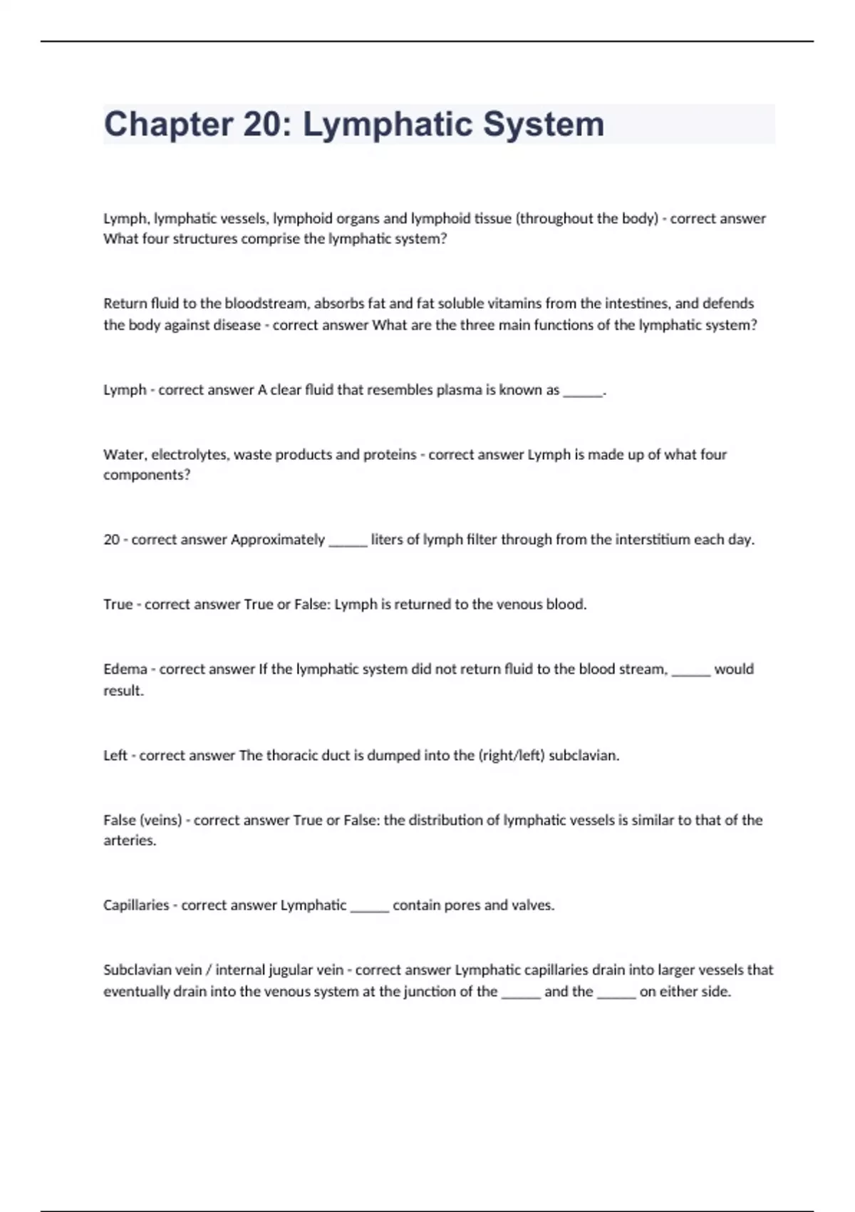 Chapter 20: Lymphatic System Lymph, lymphatic vessels, lymphoid organs and lymphoid tissue (throughout the body) - correct answer What four structures comprise the lymphatic system? Return fluid to the bloodstream, absorbs fat and fat soluble vitamins from the intestines, and defends the body against disease - correct answer What are the three main functions of the lymphatic system? Lymph - correct answer A clear fluid that resembles plasma is known as _____. Water, electrolytes, waste products and proteins - correct answer Lymph is made up of what four components? 20 - correct answer Approximately _____ liters of lymph filter through from the interstitium each day. True - correct answer True or False: Lymph is returned to the venous blood. Edema - correct answer If the lymphatic system did not return fluid to the blood stream, _____ would result. Left - correct answer The thoracic duct is dumped into the (right/left) subclavian. False (veins) - correct answer True or False: the distribution of lymphatic vessels is similar to that of the arteries. Capillaries - correct answer Lymphatic _____ contain pores and valves. Subclavian vein / internal jugular vein - correct answer Lymphatic capillaries drain into larger vessels that eventually drain into the venous system at the junction of the _____ and the _____ on either side.