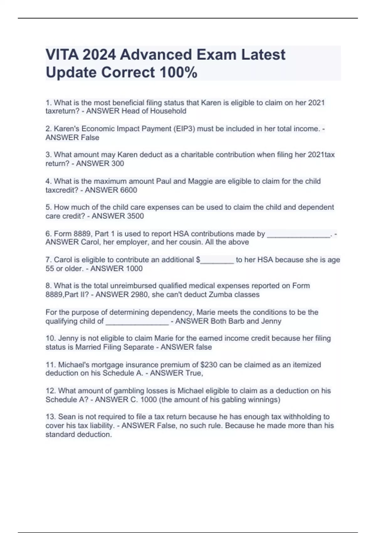 1. What is the most beneficial filing status that Karen is eligible to claim on her 2021 taxreturn? - ANSWER Head of Household 2. Karen's Economic Impact Payment (EIP3) must be included in her total income. - ANSWER False 3. What amount may Karen deduct as a charitable contribution when filing her 2021tax return? - ANSWER 300 4. What is the maximum amount Paul and Maggie are eligible to claim for the child taxcredit? - ANSWER 6600 5. How much of the child care expenses can be used to claim the child and dependent care credit? - ANSWER 3500 6. Form 8889, Part 1 is used to report HSA contributions made by _______________. - ANSWER Carol, her employer, and her cousin. All the above 7. Carol is eligible to contribute an additional $________ to her HSA because she is age 55 or older. - ANSWER 1000