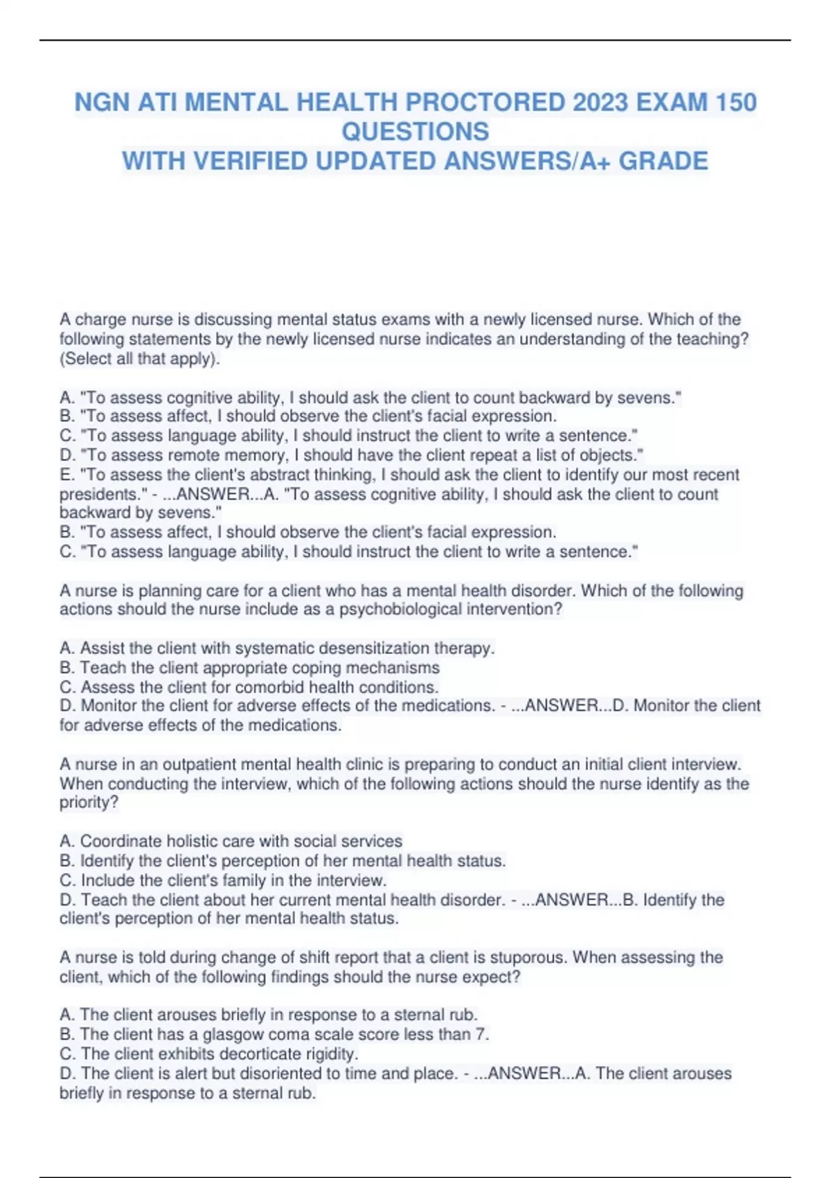 NGN ATI MENTAL HEALTH PROCTORED 2023 EXAM 150 QUESTIONS WITH VERIFIED UPDATED ANSWERS/A+ GRADE