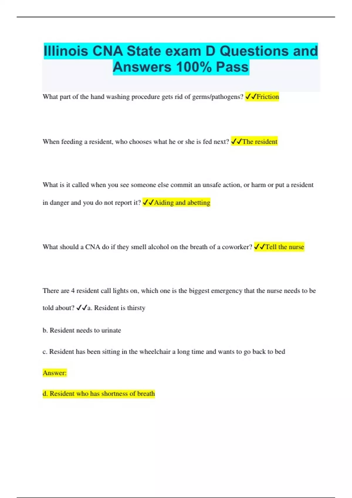 Illinois CNA State exam D Questions and Answers 100% Pass What part of the hand washing procedure gets rid of germs/pathogens? Friction When feeding a resident, who chooses what he or she is fed next? The resident What is it called when you see someone else commit an unsafe action, or harm or put a resident in danger and you do not report it? Aiding and abetting What should a CNA do if they smell alcohol on the breath of a coworker? Tell the nurse There are 4 resident call lights on, which one is the biggest emergency that the nurse needs to be told about? a. Resident is thirsty b. Resident needs to urinate c. Resident has been sitting in the wheelchair a long time and wants to go back to bed Answer: d. Resident who has shortness of breath A resident has respirations of 32bpm. What is the medical term for this? Tachypnea A resident is complaining of a headache, sissiness and his skin is cold and clammy. They are probably experiencing what condition? Hypoglycemia - "Warm and dry - Blood sugar High" "Cold and clammy-Eat some candy" What is the main focus for the resident in RESTORATIVE CARE? The resident's abilities and strengths How do you transport someone in a geriatric chair? Push it like a wheelchair After a resident is discharged, what is the procedure called that the CNA does when cleaning a room? Wen cleaning a whirlpool bath, what do you do? Disinfection NOT Sterilization A CNA finds a frayed cord on the call light. What should she do? Call maintenance. Don't try an fix it. Don't use until it is fixed. Maintenance is in charge of electrical equipment and problems. A CNA checks a resident's blood pressure and gets a reading of 160/94. What should she do next? Recheck the BP and report it to the nurse. A resident gets a call while they are at an activity, what should you do? Take a message and have the resident call back later. You have a resident in isolation. What should you do before taking a collected specimen out of the room? Double bag the specimen A resident has asked to use the urinal so you give it to him. What should you tell him to do when he is finished using the urinal? Put on t