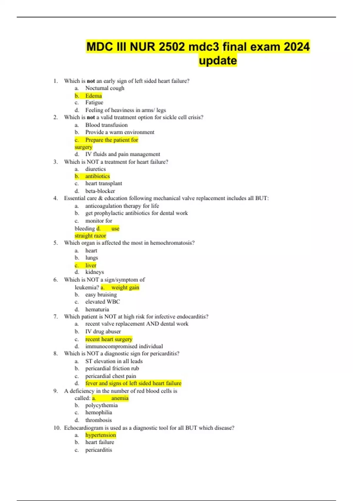 MDC III NUR 2502 mdc3 final exam 2024 update MDC III NUR 2502 mdc3 final exam 2024 update 1. Which is not an early sign of left sided heart failure? a. Nocturnal cough b. Edema c. Fatigue d. Feeling of heaviness in arms/ legs 2. Which is not a valid treatment option for sickle cell crisis? a. Blood transfusion b. Provide a warm environment c. Prepare the patient for surgery d. IV fluids and pain management 3. Which is NOT a treatment for heart failure? a. diuretics b. antibiotics c. heart transplant d. beta-blocker 4. Essential care & education following mechanical valve replacement includes all BUT: a. anticoagulation therapy for life b. get prophylactic antibiotics for dental work c. monitor for bleeding d. use straight razor 5. Which organ is affected the most in hemochromatosis? a. heart b. lungs c. liver d. kidneys 6. Which is NOT a sign/symptom of leukemia? a. weight gain b. easy bruising c. elevated WBC d. hematuria 7. Which patient is NOT at high risk for infective endocarditis? a. recent valve replacement AND dental work b. IV drug abuser c. recent heart surgery d. immunocompromised individual 8. Which is NOT a diagnostic sign for pericarditis? a. ST elevation in all leads b. pericardial friction rub c. pericardial chest pain d. fever and signs of left sided heart failure 9. A deficiency in the number of red blood cells is called: a. anemia b. polycythemia c. hemophilia d. thrombosis 10. Echocardiogram is used as a diagnostic tool for all BUT which disease? a. hypertension b. heart failure c. pericarditis d. valvular heart disease 11. Which lab test is most likely elevated in hemophilia? a. Prothrombin time b. Creatinine c. Leukocytes d. Activated partial thromboplastin time 12. Why would a patient have a pericardiocentesis? a. for pericardial effusions b. for cardiac tamponade c. for pleural effusions d. for ascites 13. Which is NOT a sign/symptom of dilated cardiomyopathy? a. Echo shows ventricular hypertrophy b. weakness c. Echo shows dilated ventricles d. Palpitations 14. The medical term for platelet is: a. erythrocyte b. leukocyte c. phagocyte d. thrombocyte 15. Which is NOT a recommendation for hypertension? a. increase sodium intake b. exercise 3-4 times per week c. lose weight d. adhere to medication regime prescribed 16. Which is NOT a treatment in PAD? a. antiplatelet medication b. wear insulated shoes c. cross legs when sitting d. dependent positioning 17. Which is included in education for polycythemia vera? a. wear support hose during the day b. drink 3L of fluid daily c. elevate feet when seated d. exercise as much as you want 18. What should be avoided in patients with thrombocytopenia? a. rectal trauma, including enemas b. oral trauma, flossing c. contact sports d. electric shaver 19. Which is an early sign of multiple myeloma? a. easy bruising b. hypertension c. bone fractures d. infection 20. Signs and symptoms of lymphoma include all BUT: a. fevers b. night sweats c. enlarged lymph nodes d. syncope 21. What is the priority action when a reaction to an infusion is suspected? a. check the vitals b. reposition the patient c. stop the infusion d. assess the lung sounds 22. Which is NOT a treatment for SVT? a. glucose administration b. adenosine c. vagal maneuvers d. synchronized cardioversion 23. Which lab value is out of range? a. Hemoglobin - 15.0 mg/dL b. platelets 200,000 mm3 c. white cell count 8,000 mm3 d. prothrombin time of 26 seconds 24. What is NOT a sign or symptom associate with hemophilia? a. hypertension b. abnormal or excessive bleeding c. joint and muscle hemorrhages d. joint and muscle pain 25. Which sounds is indicative of mitral regurgitation? a. high-pitched holosystolic murmur b. rumbling, apical diastolic murmur c. blowing, decrescendo diastolic murmur d. systolic click 26. Which sounds is indicative of mitral valve prolapse? a. high-pitched holosystolic murmur b. rumbling, apical diastolic murmur c. blowing, decrescendo diastolic murmur d. systolic click 27. Which sounds is indicative of aortic regurgitation? a. high-pitched holosystolic murmur b. rumbling, apical diastolic murmur c. blowing, decrescendo diastolic murmur d. systolic click 28. Which post-anesthetic care patient should be seen / assessed first? a. A patient with respiratory depression b. A patient with decreased blood pressure c. A patient complaining of pain d. An alert patient ready for transfer to the floor 29. The nurse is preparing for initial rounds. Which patient should the nurse assess first? a. A client with diabetes with a glucose of 180 b. A teenager scheduled for PT this morning c. A 78 year old with a pressure dressing needing changing d. a 35 year old with copious secretions from his tracheostomy 1. Signs and Symptoms of Left sided Heart Failure (SATA) a. Pulmonary Edema b. Coughing c. Crackles d. Dependent Edema 2. How often should a patient with heart failure weigh themselves? a. Weekly b. Monthly c. Daily d. Hourly 3. What blood test is used to detect heart failure? a. Triponins b. CBC c. BNP d. ABGs 4. What diagnostic test is the gold standard to determine if a patient has heart failure? a. ECHO b. MRI c. Chest Xray d. Ultrasound 5. What are some risk factors that can lead to heart failure? (SATA) a. Lifestyle b. Hypertension c. Smoking d. Diabetes 6. What can predispose a patient to mitral stenosis? a. Rheumatic Fever b. Age c. Connective tissue disorder d. Infective endocarditis 7. What is NOT as symptom of mitral valve stenosis? a. Fatigue b. Hypertension c. Dyspnea on exertion d. Pink frothy Sputum 8. How is mitral valve stenosis treated? (select 2) a. Valve replacement b. transcatheter valve therapy c. Heart transplant d. Percutaneous balloon valvuloplasty 9. What is the best treatment for a patient with end stage heart failure? a. Heart Transplant b. Beta Blockers c. Coronary Artery Bypass Graft d. Percutaneous balloon valvuloplasty 10. What is the cardinal sign for pulmonary edema? a. Frothy Sputum b. Dyspnea c. Wheezes d. Syncope on exertion 11. What