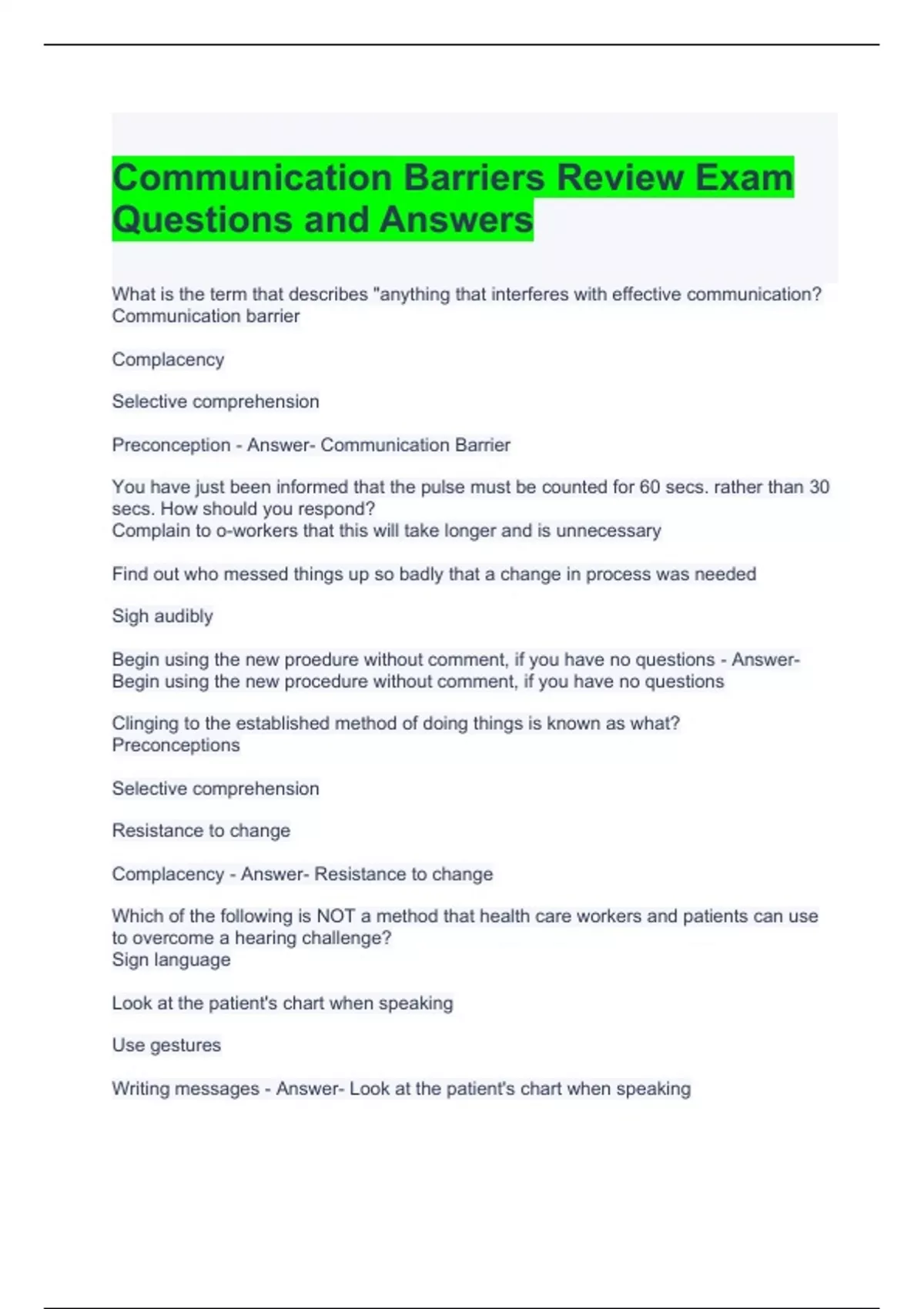 Communication Barriers Review Exam Questions and Answers