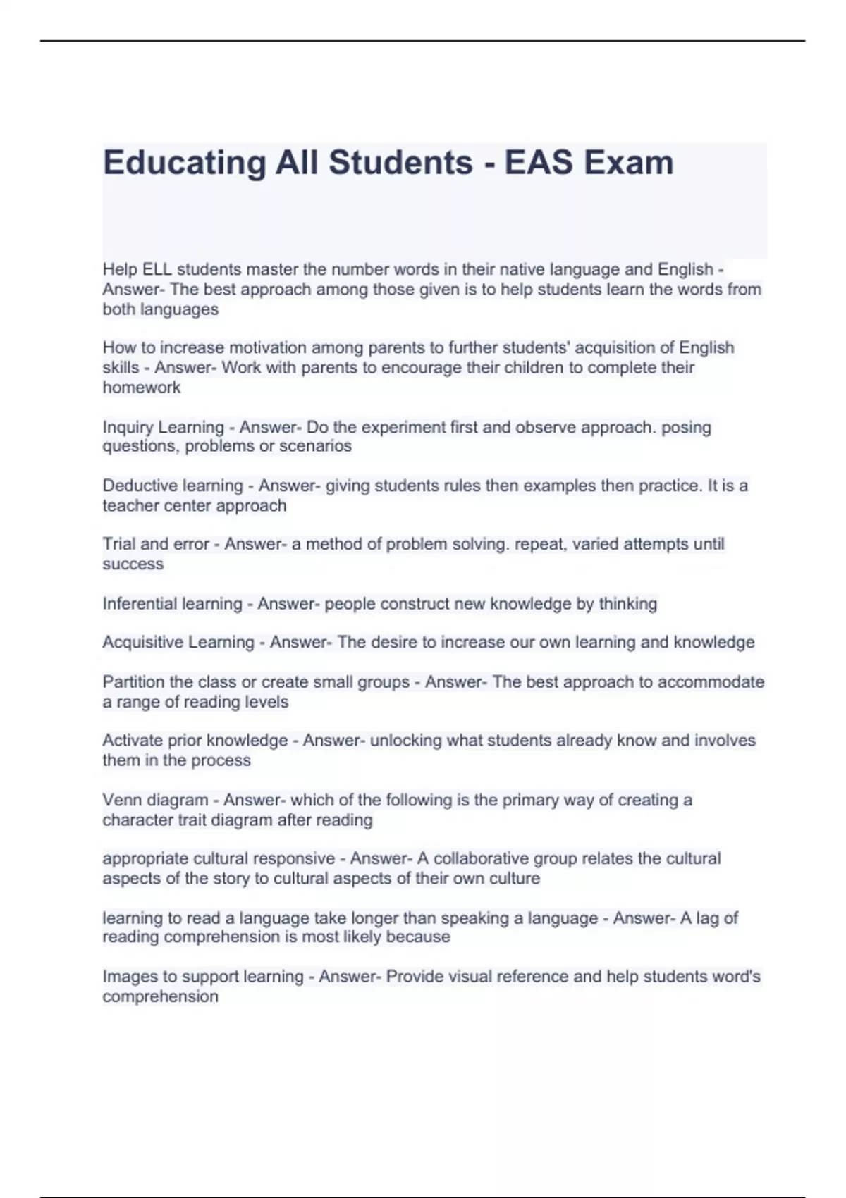 Educating All Students - EAS Exam Questions and Answers