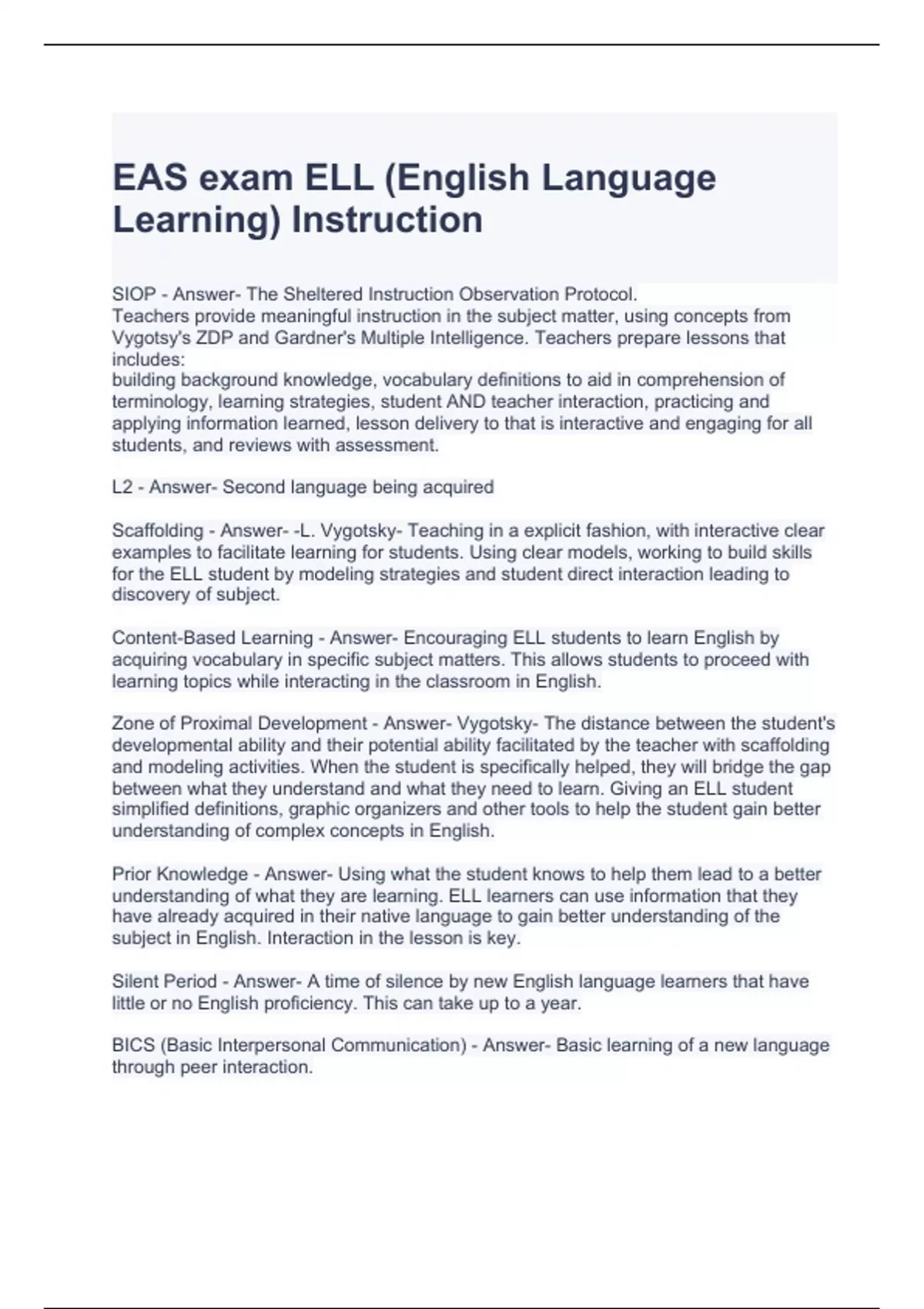 EAS exam ELL (English Language Learning) Instruction Questions and Answers