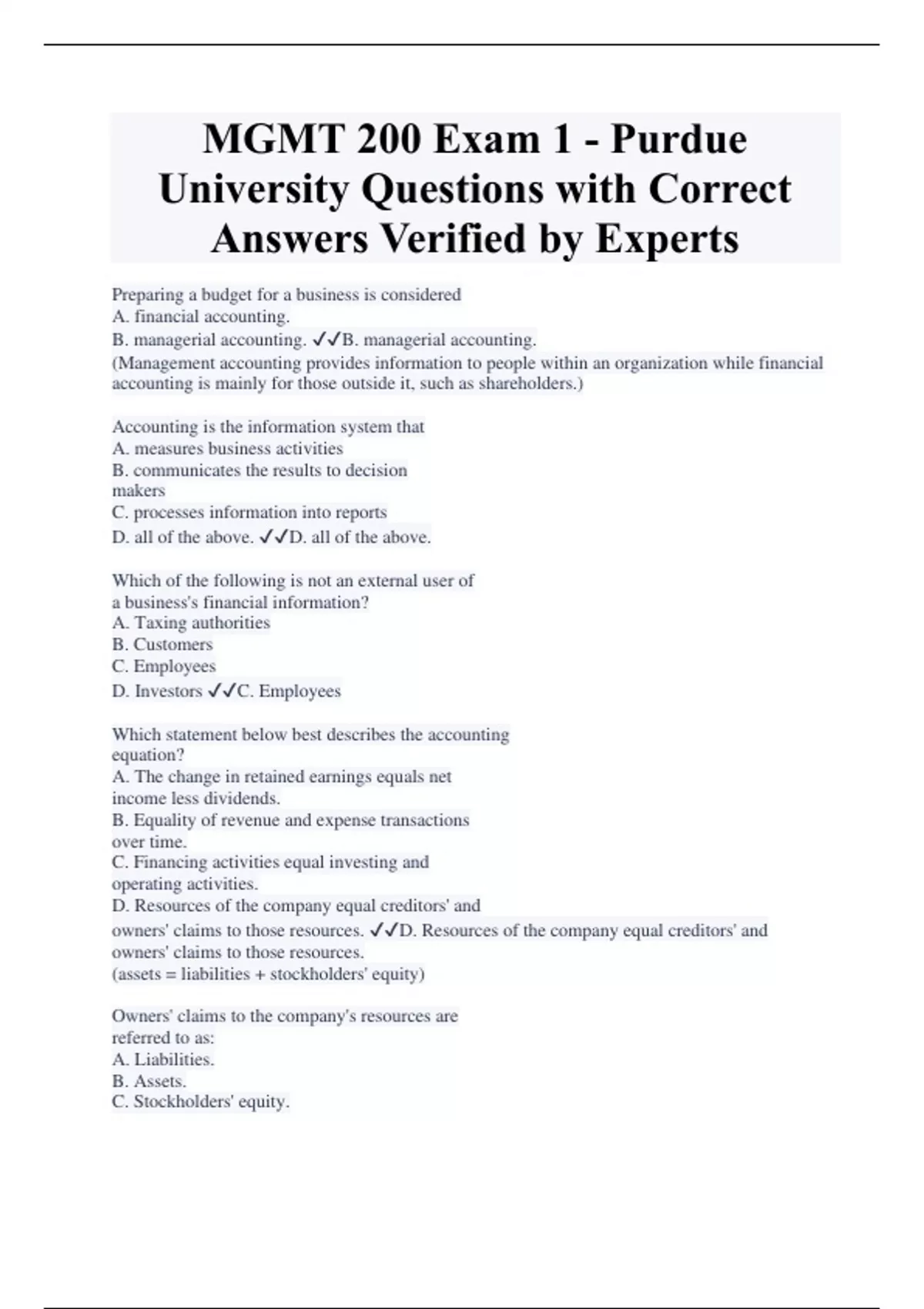 MGMT 200 Exam 1 - Purdue University Questions with Correct Answers Verified by Experts Preparing a budget for a business is considered A. financial accounting. B. managerial accounting. B. managerial accounting. (Management accounting provides information to people within an organization while financial accounting is mainly for those outside it, such as shareholders.) Accounting is the information system that A. measures business activities B. communicates the results to decision makers C. processes information into reports D. all of the above. D. all of the above. Which of the following is not an external user of a business's financial information? A. Taxing authorities B. Customers C. Employees D. Investors C. Employees Which statement below best describes the accounting equation? A. The change in retained earnings equals net income less dividends. B. Equality of revenue and expense transactions over time. C. Financing activities equal investing and operating activities. D. Resources of the company equal creditors' and owners' claims to those resources. D. Resources of the company equal creditors' and owners' claims to those resources. (assets = liabilities + stockholders' equity)