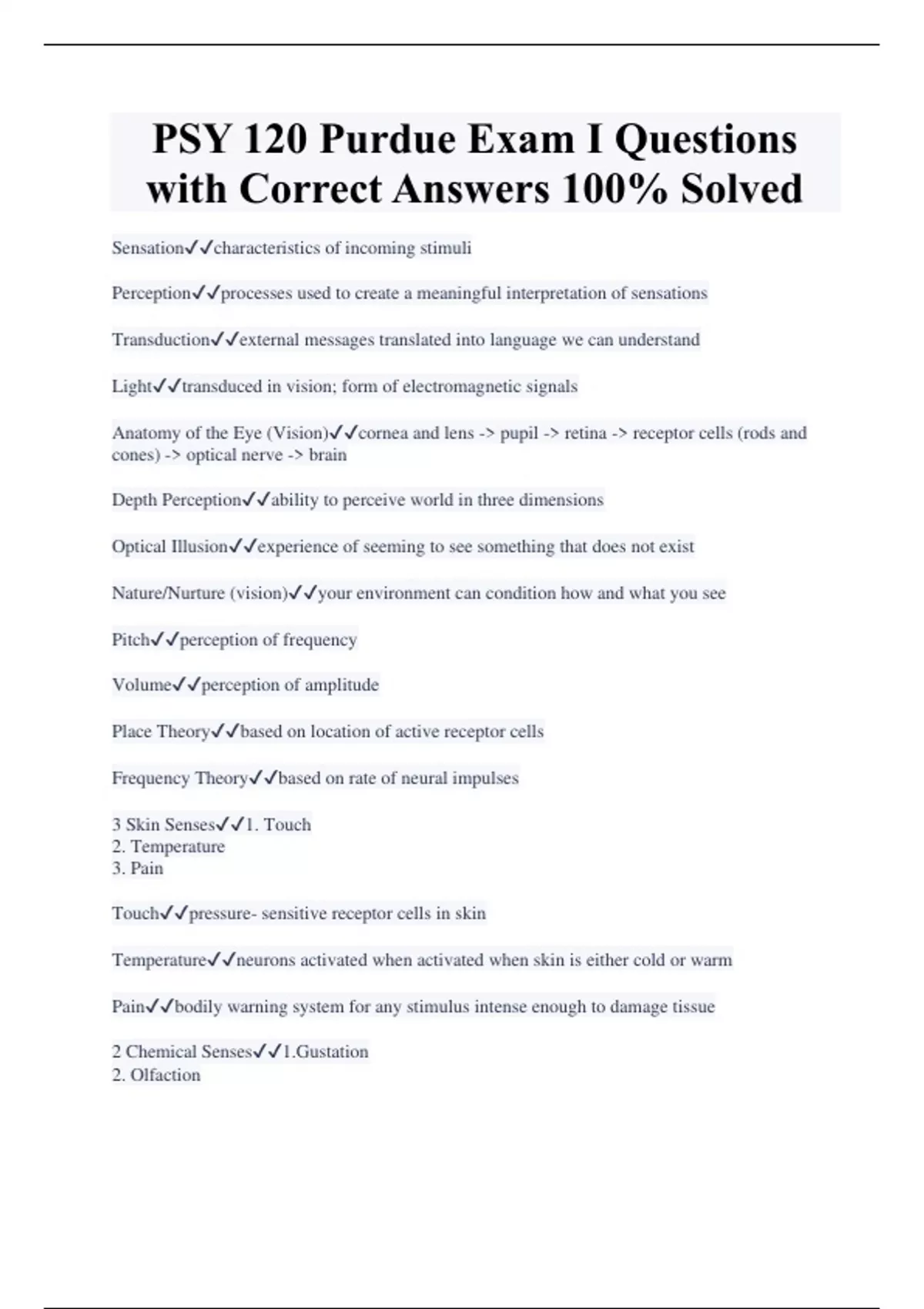 PSY 120 Purdue Exam I Questions with Correct Answers 100% Solved Sensationcharacteristics of incoming stimuli Perceptionprocesses used to create a meaningful interpretation of sensations Transductionexternal messages translated into language we can understand Lighttransduced in vision; form of electromagnetic signals Anatomy of the Eye (Vision)cornea and lens -> pupil -> retina -> receptor cells (rods and cones) -> optical nerve -> brain Depth Perceptionability to perceive world in three dimensions Optical Illusionexperience of seeming to see something that does not exist Nature/Nurture (vision)your environment can condition how and what you see Pitchperception of frequency Volumeperception of amplitude Place Theorybased on location of active receptor cells Frequency Theorybased on rate of neural impulses 3 Skin Senses1. Touch 2. Temperature 3. Pain Touchpressure- sensitive receptor cells in skin Temperatureneurons activated when activated when skin is either cold or warm Painbodily warning system for any stimulus intense enough to damage tissue 2 Chemical Senses1.Gustation 2. Olfaction