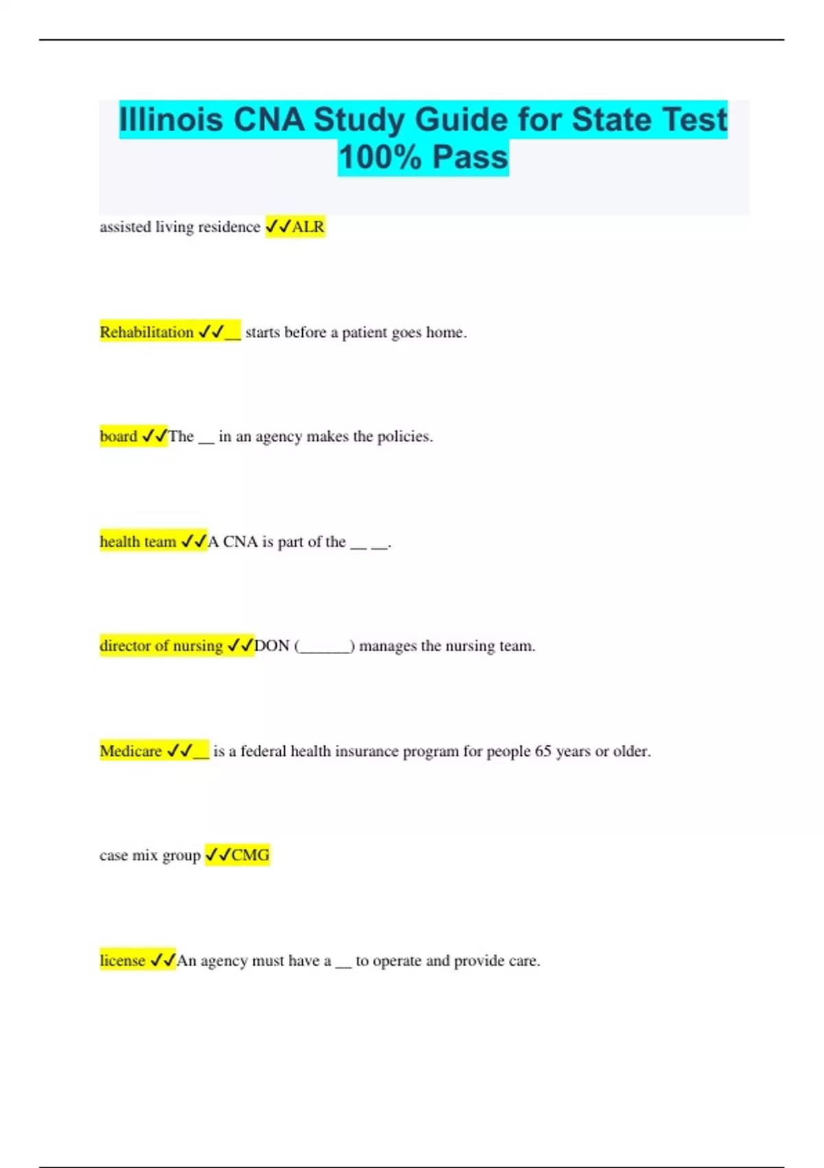 Illinois CNA Study Guide for State Test 100% Pass assisted living residence ALR Rehabilitation __ starts before a patient goes home. board The __ in an agency makes the policies. health team A CNA is part of the __ __. director of nursing DON (______) manages the nursing team. Medicare __ is a federal health insurance program for people 65 years or older. case mix group CMG license An agency must have a __ to operate and provide care. American Hospital Association AHA Omnibus Budget Reconciliation Act of 1987 OBRA licensed nursing assistant LNA Nursing Assistant Training and Competency Evaluation Program NATCEP laws, job descriptions, person's condition, help Some limits for CNAs are __, __ __, the __ __, and the amount of __ you need. Nurse Practice Acts __ __ __ protects patients from people practicing nursing without a license. 75 OBRA requires at least __ hours of instruction for CNAs. (training for nursing assistants working in nursing centers) task, circumstances, person, directions, communication, supervision The Five Rights of Delegation are the right __, __, __, __ & __, and __. responsible When you agree to do a task, you are __ for you own actions. If a delegated task is beyond your legal limits, politely refuse and explain why. medication, tubes, orders, diagnoses A CNA can't give __, insert __, take __ from doctors, or discuss the person's __ with the family. wills CNAs are not allowed to prepare __ for people. neglect; verbal abuse If a call light is on, not answering it is __. Shouting is __ __. domestic, intimate partner, partner, spousal Domestic abuse is also called __ violence, __ __ abuse, __ abuse, and __ abuse. gossiping Remove yourself from a group or setting where people are __.
