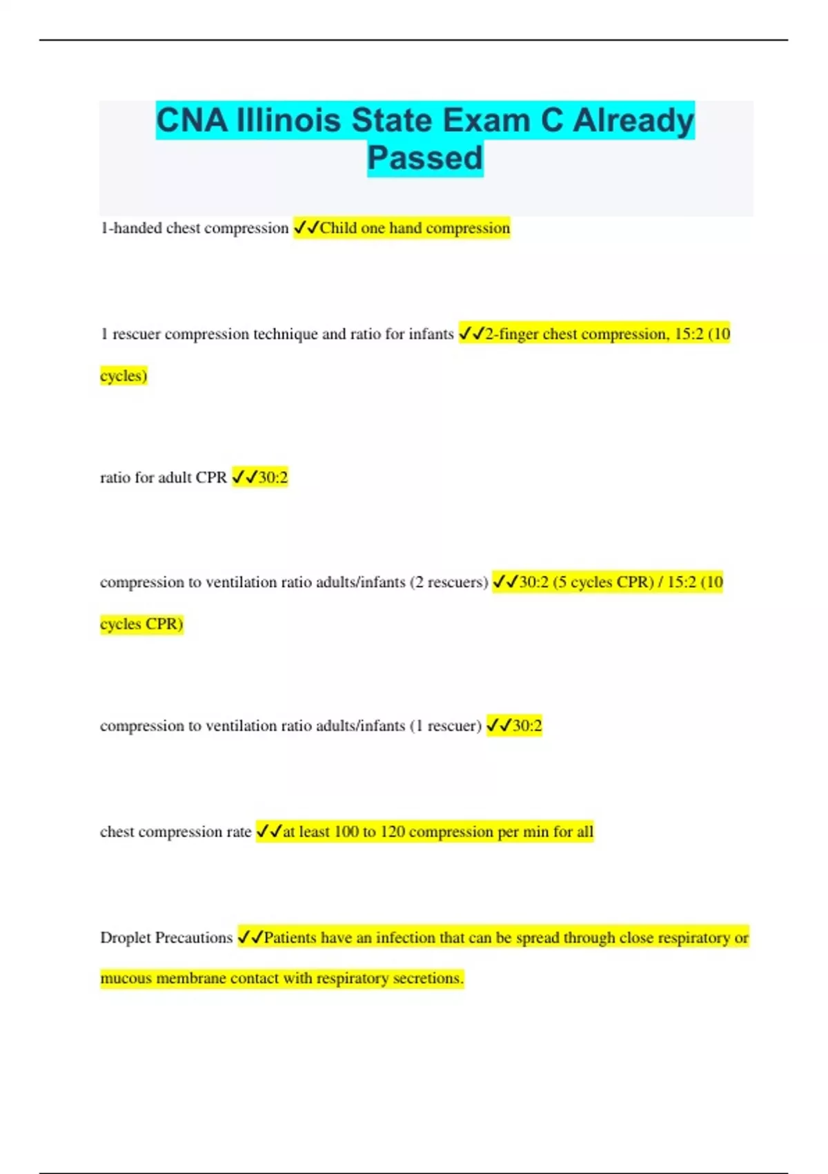 CNA Illinois State Exam C Already Passed 1-handed chest compression Child one hand compression 1 rescuer compression technique and ratio for infants 2-finger chest compression, 15:2 (10 cycles) ratio for adult CPR 30:2 compression to ventilation ratio adults/infants (2 rescuers) 30:2 (5 cycles CPR) / 15:2 (10 cycles CPR) compression to ventilation ratio adults/infants (1 rescuer) 30:2 chest compression rate at least 100 to 120 compression per min for all Droplet Precautions Patients have an infection that can be spread through close respiratory or mucous membrane contact with respiratory secretions. Airborne Precautions Patient have an infection that can be spread over long distances when suspended in the air. These disease particles are very small and require special respiratory protection and room ventilation. Examples of airborne precautions Chickenpox, measles, and tuberculosis Example of contact Salmonella, scabies, shigella, and pressure ulcers Oral 97.6-99.6 Rectal 98.6-100.6 Arm pit (Axillary) 96.6-98.6 Tympanic membrane 98.6 Pulse 60-100 beats per minute Respirations 12-20 breaths systolic (Top number) 90-120 Diastolic pressure (bottom number) 60-80 Pretension 120-139/80-90 hypertension 140/90 or higher hypotension (low blood pressure) 90/60 and below fowlers position 45-60 degrees Semi fowlers 30 degrees high fowlers 90 degrees supine laying on back Prone laying on the stomach lateral side laying position on either side Sims' "semi prone side postion" left side laying position active ROM patient does exercise passive ROM caregiver does exercises active-assistive ROM caregiver helps patient do exercises flexion bending of a joint extension straightening of a joint abduction moving a body part away from mid line adduction moving a body part away from the midline rotation twisting/turning a joint supination palm up pronation palm down eversion rotating foot outward inversion rotating foot inward dorsiflexion bending foot upward plantar flexion pointing foot downward Removing PPE Gloves, goggles, gown, mask