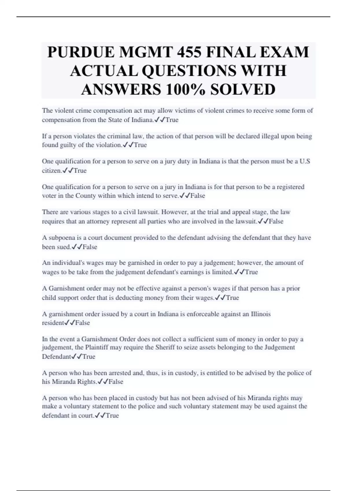 PURDUE MGMT 455 FINAL EXAM ACTUAL QUESTIONS WITH ANSWERS 100% SOLVED The violent crime compensation act may allow victims of violent crimes to receive some form of compensation from the State of Indiana.True If a person violates the criminal law, the action of that person will be declared illegal upon being found guilty of the violation.True One qualification for a person to serve on a jury duty in Indiana is that the person must be a U.S citizen.True One qualification for a person to serve on a jury in Indiana is for that person to be a registered voter in the County within which intend to serve.False There are various stages to a civil lawsuit. However, at the trial and appeal stage, the law requires that an attorney represent all parties who are involved in the lawsuit.False A subpoena is a court document provided to the defendant advising the defendant that they have been sued.False An individual's wages may be garnished in order to pay a judgement; however, the amount of wages to be take from the judgement defendant's earnings is limited.True