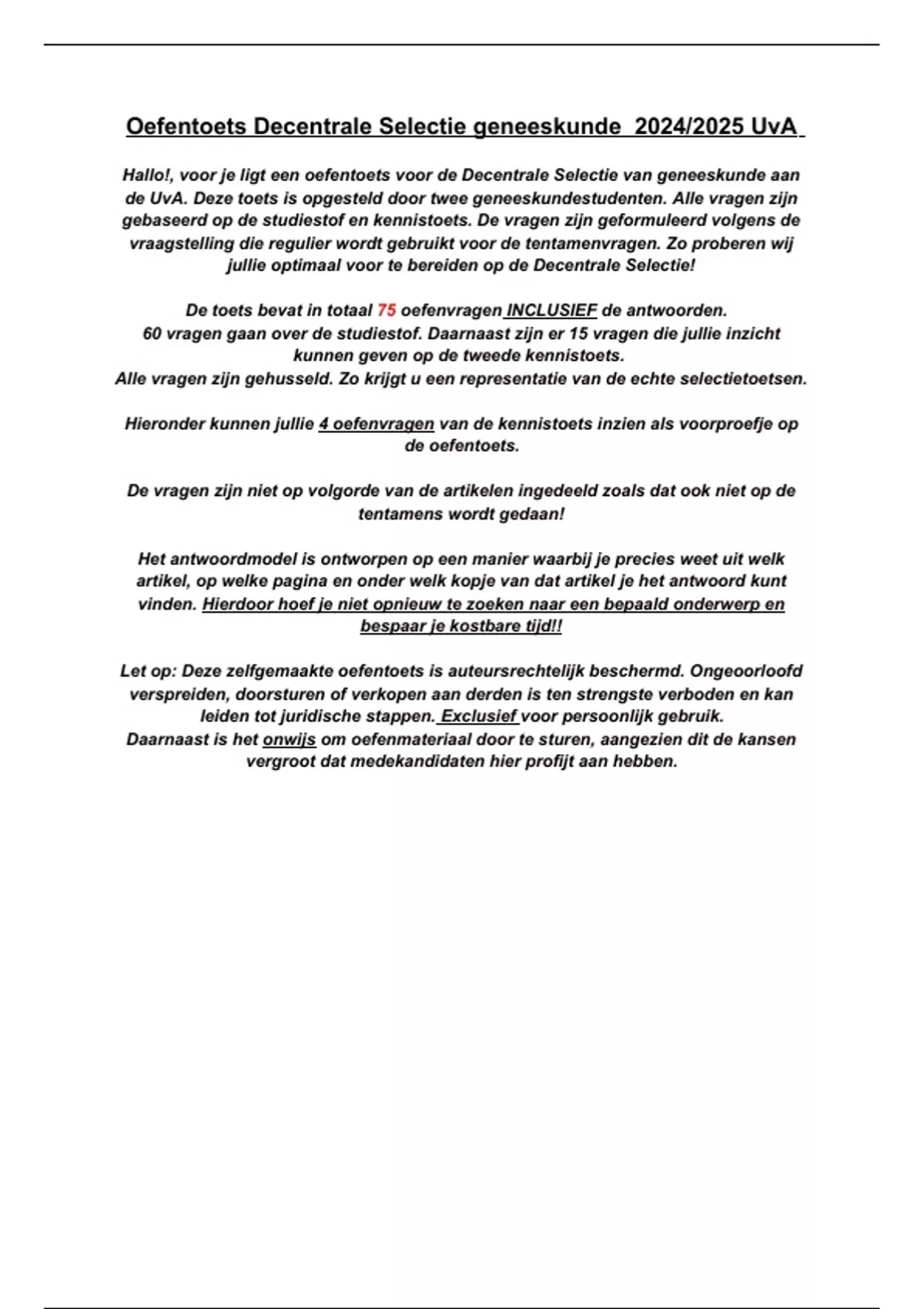 Hallo!, voor je ligt een oefentoets voor de Decentrale Selectie van geneeskunde aan de UvA. Deze toets is opgesteld door twee geneeskundestudenten. Alle vragen zijn gebaseerd op de studiestof en de kennistoets. De vragen zijn geformuleerd volgens de vraagstelling die regulier wordt gebruikt voor de tentamenvragen. Zo proberen wij jullie optimaal voor te bereiden op de Decentrale Selectie! De toets bevat in totaal 75 oefenvragen INCLUSIEF de antwoorden. 60 vragen gaan over de studiestof. Daarnaast zijn er 15 vragen die jullie inzicht kunnen geven op de tweede kennistoets.