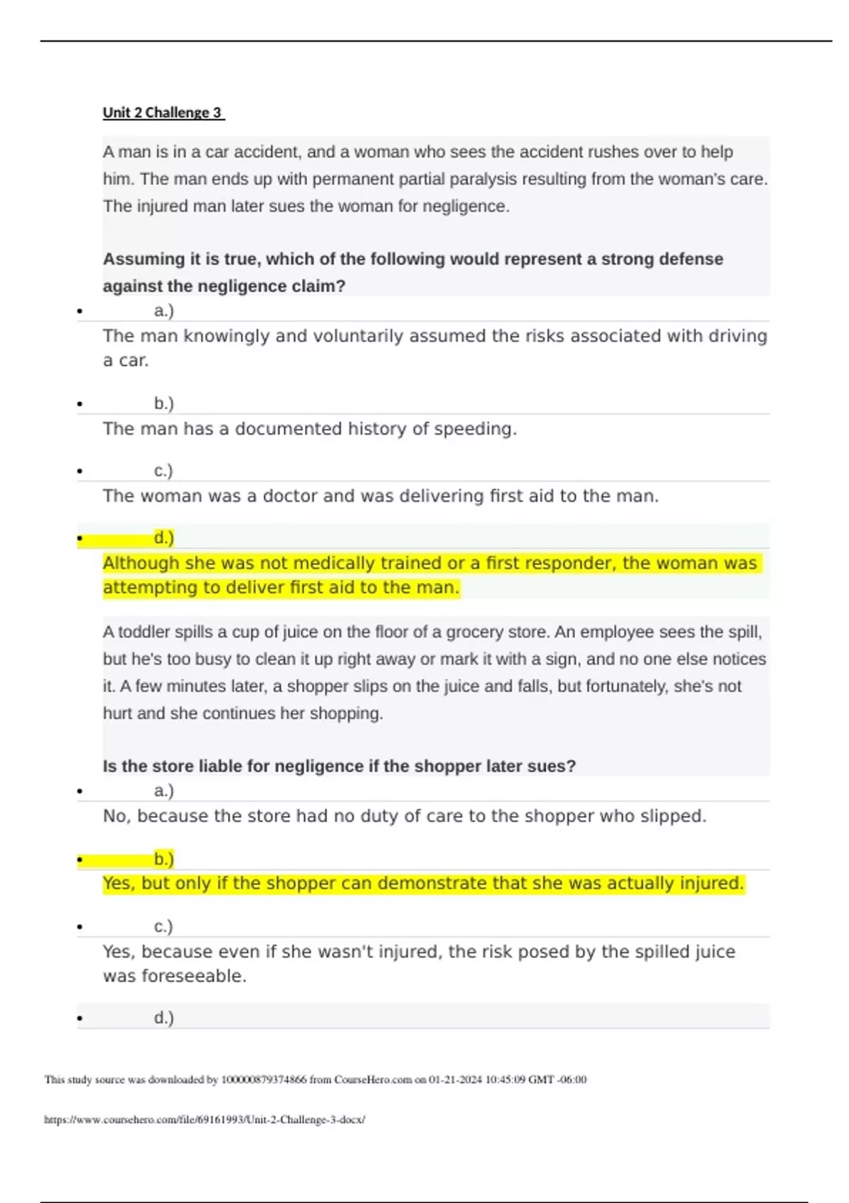 Unit 2 Challenge 3 A man is in a car accident, and a woman who sees the accident rushes over to help him. The man ends up with permanent partial paralysis resulting from the woman's care. The injured man later sues the woman for negligence. Assuming it is true, which of the following would represent a strong defense against the negligence claim? a.) The man knowingly and voluntarily assumed the risks associated with driving a car. b.) The man has a documented history of speeding. c.) The woman was a doctor and was delivering first aid to the man. d.) Although she was no