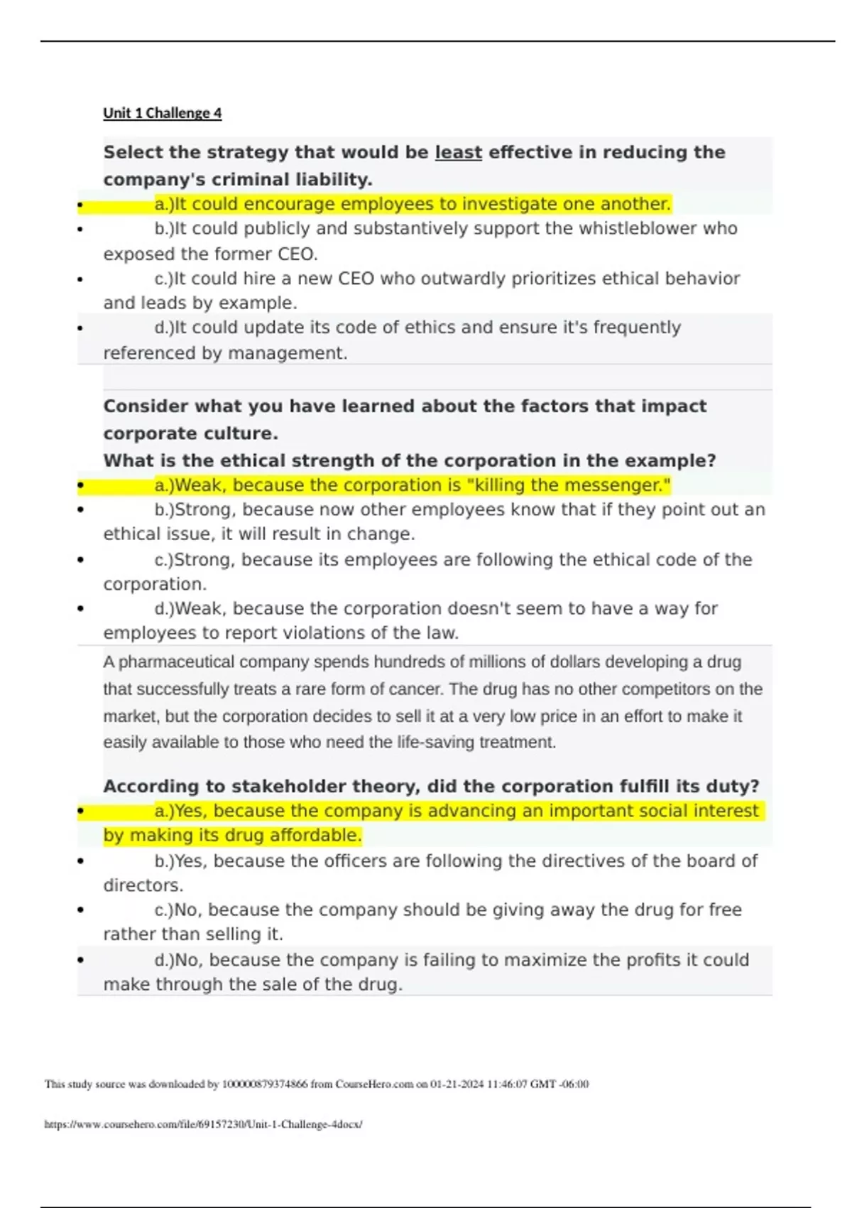 Unit 1 Challenge 4 Select the strategy that would be least effective in reducing the company's criminal liability. a.)It could encourage employees to investigate one another. b.)It could publicly and substantively support the whistleblower who exposed the former CEO. c.)It could hire a new CEO who outwardly prioritizes ethical behavior and leads by example. d.)It could update its code of ethics and ensure it's frequently referenced by management. Consider what you have learned about the factors that impact corporate culture. What is the ethical strength of the corporation in the example? a.)Weak, because the corporation is "killing the messenger." b.)Strong, because now other employees know that if they point out an ethical issue, it will result in change. c.)Strong, because its employees are following the ethical code of the corporation. d.)Weak, because the corporation doesn't seem to have a way for employees to report violations of the law. A pharmaceutical company spends hundreds of millions of dollars developing a drug that successfully treats a rare form of cancer. The drug has no other competitors on the market, but the corporation decides to sell it at a very low price in an effort to make it easily available to those who need the life-saving treatment. According to stakeholder theory, did the corporation fulfill its duty? a.)Yes, because the company is advancing an important social interest by making its drug affordable. b.)Yes, because the officers are following the directives of the board of directors. c.)No, because the company should be giving away the drug for free rather than selling it. d.)No, because th