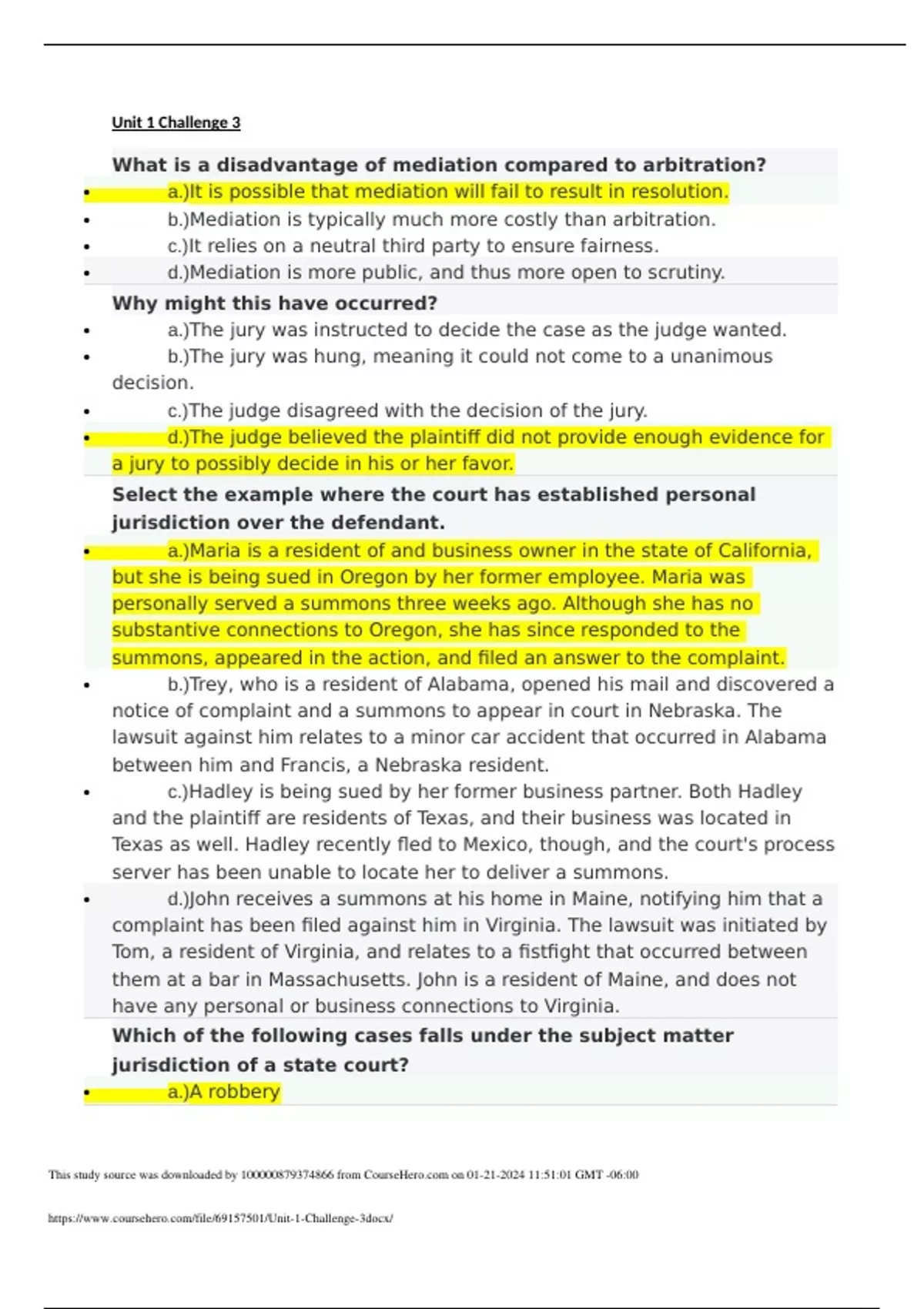 Unit 1 Challenge 3 What is a disadvantage of mediation compared to arbitration? a.)It is possible that mediation will fail to result in resolution. b.)Mediation is typically much more costly than arbitration. c.)It relies on a neutral third party to ensure fairness. d.)Mediation is more public, and thus more open to scrutiny. Why might this have occurred? a.)The jury was instructed to decide the case as the judge wanted. b.)The jury was hung, meaning it could not come to a unanimous decision. c.)The judge disagreed with the decision of the jury. d.)The judge believed the plaintiff did not provide enough evidence for a jury to possibly decide in his or her favor. Select the ex