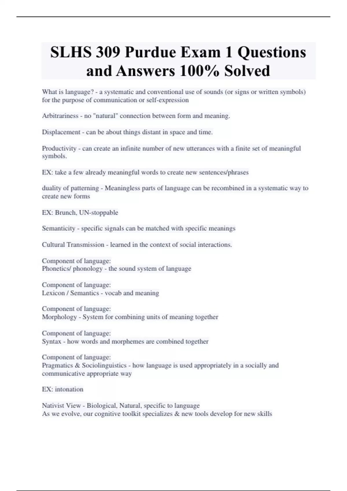 SLHS 309 Purdue Exam 1 Questions and Answers 100% Solved What is language? - a systematic and conventional use of sounds (or signs or written symbols) for the purpose of communication or self-expression Arbitrariness - no "natural" connection between form and meaning. Displacement - can be about things distant in space and time. Productivity - can create an infinite number of new utterances with a finite set of meaningful symbols. EX: take a few already meaningful words to create new sentences/phrases duality of patterning - Meaningless parts of language can be recombined in a systematic way to create new forms EX: Brunch, UN-stoppable Semanticity - specific signals can be matched with specific meanings Cultural Transmission - learned in the context of social interactions. Component of language: Phonetics/ phonology - the sound system of language Component of language: Lexicon / Semantics - vocab and meaning Component of language: Morphology - System for combining units of meaning together Component of language: Syntax - how words and morphemes are combined together Component of language: Pragmatics & Sociolinguistics - how language is used appropriately in a socially and communicative appropriate way EX: intonation Nativist View - Biological, Natural, specific to language As we evolve, our cognitive toolkit specializes & new tools develop for new skills