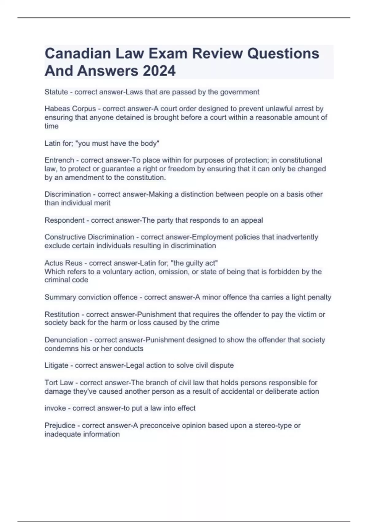 Canadian Law Exam Review Questions And Answers 2024