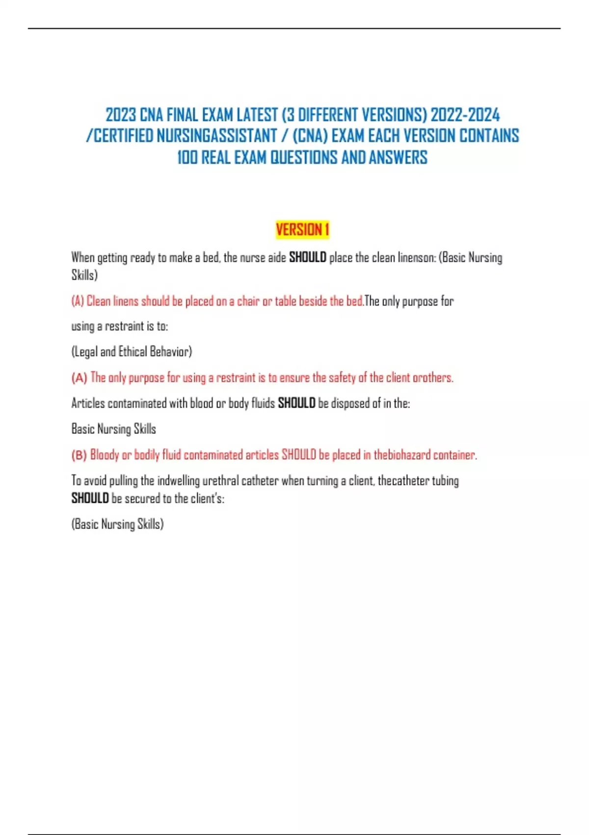2023 CNA FINAL EXAM LATEST (3 DIFFERENT VERSIONS) /CERTIFIED NURSINGASSISTANT / (CNA) EXAM EACH VERSION CONTAINS 100 REAL EXAM QUESTIONS AND ANSWERS VERSION 1 When getting ready to make a bed, the nurse aide SHOULD place the clean linenson: (Basic Nursing Skills) (A) Cleanlinens shouldbe placedon a chair or table besidethe bed.Theonlypurpose for usinga restraint is to: (LegalandEthical Behavior) (A) Theonlypurposeforusinga restraint is toensure thesafetyof the clientorothers. Articles contaminated withblood orbody fluids SHOULD bedisposedof inthe: Basic Nursing Skills (B) Bloody or bodily fluid contaminated articles SHOULD be placed in thebiohazardcontainer. To avoid pulling the indwelling urethral catheter when turning a client, thecatheter tubing SHOULD besecuredto theclient’s: (Basic Nursing Skills) B. The tubingshouldbesecuredto the patient's upper thigh. When collecting a 24-hour urine sample for a client, the nurseaide SHOULD request that the client: (Basic Nursing Skills) (D) The nurseaideshoulddiscard the first voidedurine. Whenambulating theclient, the nurseaide SHOULD: (Basic Nursing Skills) (B) When ambulating the patient, be sure the patient is wearing non-skidfootwear. Which of the following is the BEST personal protective equipment item for thenurseaide to wear whenhandling infectious wastethatcouldsplashor spray? (D) The best PPE item a nurseaide canuse for is a faceshield Which of the following would be an appropriate response for the nurse aide tomake if a client expresses anger duringcare? (D) “Youseem upset. Would you like to talkabout it?” The nurse aide has raised the height of the client’s bed to provide care to the client, butthe nurse aide forgot to bring the supplies needed. What should the nurse aide do NEXT? (C) The nurseaideshould lower thebedandplace the call light withinreach. A client requests that the nurse aide call the client’s spiritual advisor. The nurseaide SHOULD: C) tell the client that thenurseaide will inform thenurseof the client’s request. A client wakes up during the night and asks for something to eat. The nurse aideSHOULD: (A)checkclient’s diet beforeoffering nourishment. The nurse aide is preparing to bathe a client. What should the nurse aidedo FIRST? (C) Tell the client what the nurseaide is goingto do When makinga bed that is occupied bya client, the nurseaide SHOULD: (B) make the toepleat. Frequent turningand repositioningof theclienthelps prevent: (D) pressure injuries. When applying elastic stockings to the client, it would be BEST for the nurse aideto positionthe client: (A) lying downin bed. The nurse aide is in the employee dining room. A group of nurse aides are eatinglunch together and begin discussing how rude a certain client was acting. The nurseaide SHOULD: (Legaland Ethical Behavior) (B) suggest that this is not the place to discuss the client.Theclient’s signaling device SHOULD be placed: (B) within theclient’s reach. When helping a client who is recovering from a stroke to walk, the nurseaide SHOULD assist: (B) on the client’s weakside. A client who is confused begins to cry and scream out for the client’s parent.Whatshould the nurseaidedo NEXT?(Emotionaland Mental Health Needs) (C) Talk to theclient ina calm voice about familiar things. Which of the following actions would be BEST for the nurse aide to take to showrespect to thespiritual needs ofa client? (C) Assistingtheclient to readthe client’s religious materials