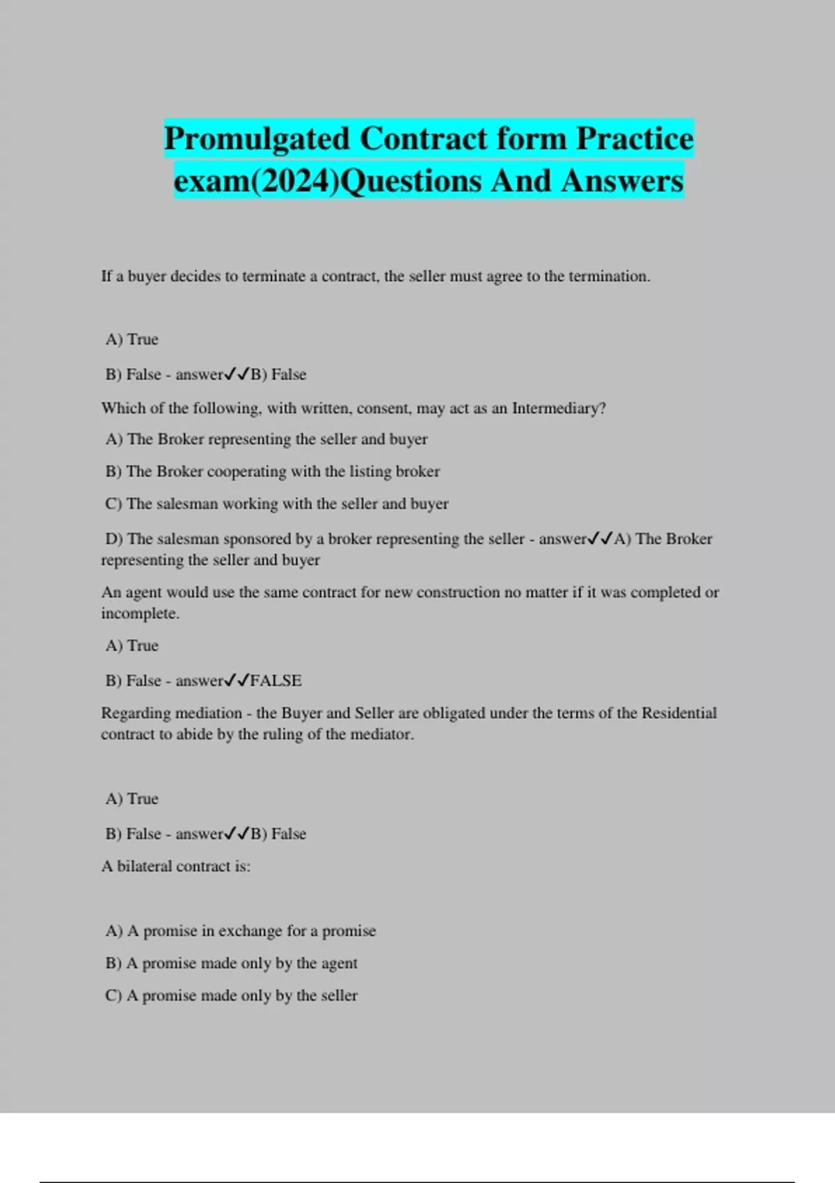 Promulgated Contract form Practice exam(2024)Questions And Answers If a buyer decides to terminate a contract, the seller must agree to the termination. A) True B) False - answerB) False Which of the following, with written, consent, may act as an Intermediary? A) The Broker representing the seller and buyer B) The Broker cooperating with the listing broker C) The salesman working with the seller and buyer D) The salesman sponsored by a broker representing the seller - answerA) The Broker representing the seller and buyer An agent would use the same contract for new construction no matter if it was completed or incomplete. A) True B) False - answerFALSE Regarding mediation - the Buyer and Seller are obligated under the terms of the Residential contract to abide by the ruling of the mediator. A) True B) False - answerB) False A bilateral contract is: A) A promise in exchange for a promise B) A promise made only by the agent C) A promise made only by the seller D) No promise - answerA) A promise in exchange for a promise The option paragraph of the contract creates an executed contract. A) True B) False - answerB) False A unilateral contract only binds one party to pe