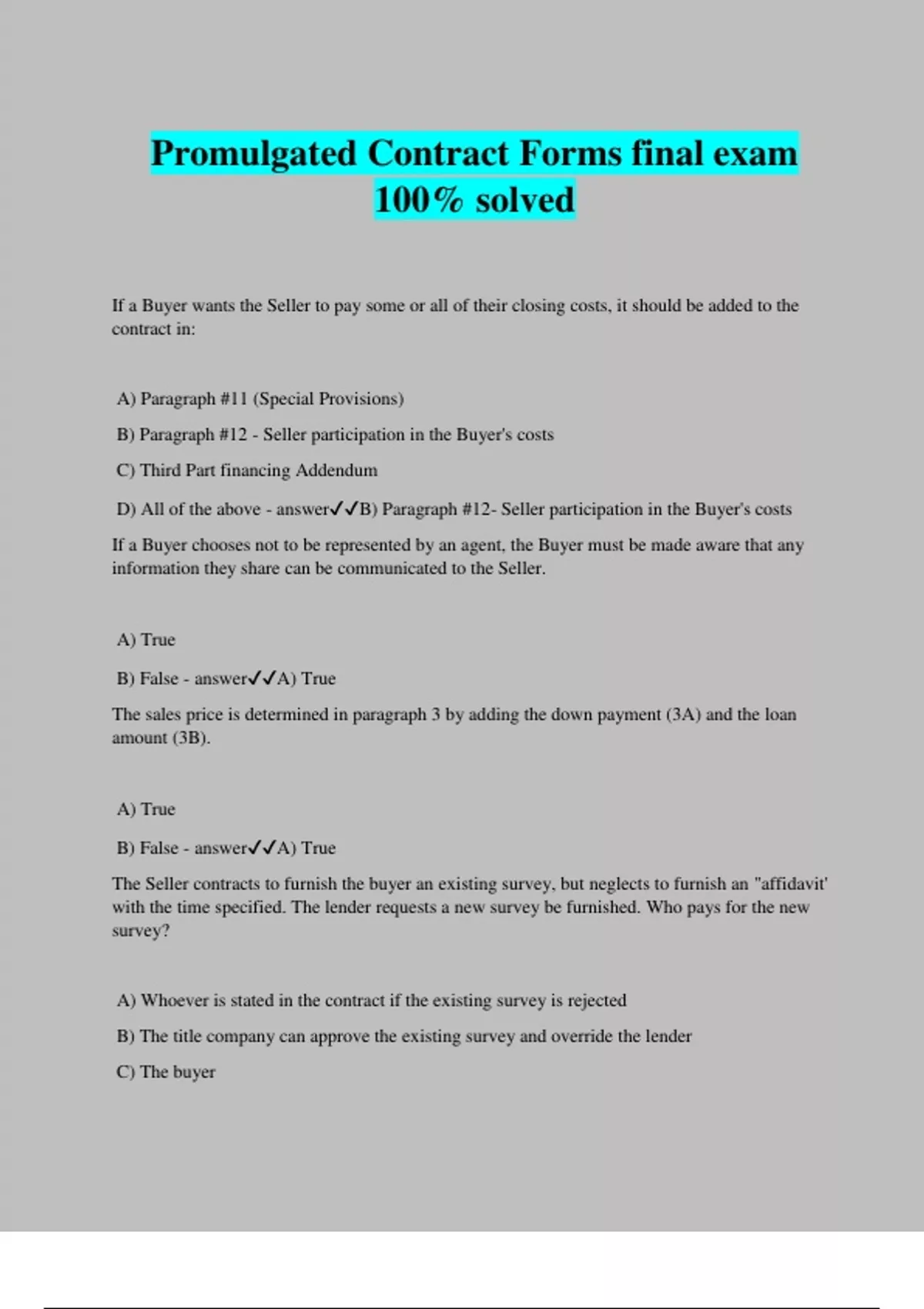 Promulgated Contract Forms final exam 100% solved If a Buyer wants the Seller to pay some or all of their closing costs, it should be added to the contract in: A) Paragraph #11 (Special Provisions) B) Paragraph #12 - Seller participation in the Buyer's costs C) Third Part financing Addendum D) All of the above - answerB) Paragraph #12- Seller participation in the Buyer's costs If a Buyer chooses not to be represented by an agent, the Buyer must be made aware that any information they share can be communicated to the Seller. A) True B) False - answerA) True The sales price is determined in paragraph 3 by adding the down payment (3A) and the loan amount (3B). A) True B) False - answerA) True The Seller contracts to furnish the buyer an existing survey, but neglects to furnish an "affidavit' with the time specified. The lender requests a new survey be furnished. Who pays for the new survey? A) Whoever is stated in the contract if the existing survey is rejected B) The title company can approve the existing survey and override the lender C) The buyer D) The seller - answerD) The seller The Third Party Financing Condition Addendum is not used with: A) Conventional financing B) Seller financing C) FHA Financing D) VA Financing - answerB) Seller financing On the Seller's default, what should happen to the earnest money? A) It belongs to the Broker B) It should be returned to the Buyer C) It should be retained by the Seller D) The title company should keep it - answerB) It should be returned to the Buyer If the contract includes an option period for the buyer and the buyer does not tender the option fee to the Seller within the time limit (currently with 3 days from effective date of the contract) the Buyer no longer has an unrestricted right to terminate under the option. A) True B) False - answerA) Tru