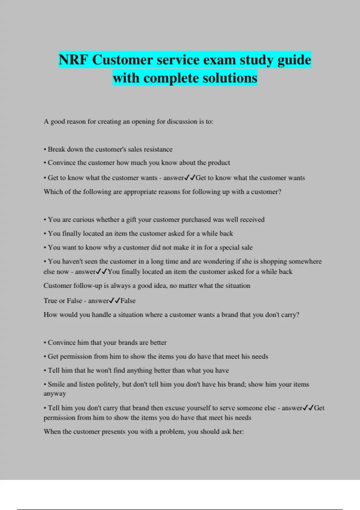 NRF Customer service exam study guide with complete solutions A good reason for creating an opening for discussion is to: • Break down the customer's sales resistance • Convince the customer how much you know about the product • Get to know what the customer wants - answerGet to know what the customer wants Which of the following are appropriate reasons for following up with a customer? • You are curious whether a gift your customer purchased was well received • You finally located an item the customer asked for a while back • You want to know why a customer did not make it in for a special sale • You haven't seen the customer in a long time and are wondering if she is shopping somewhere else now - answerYou finally located an item the customer asked for a while back Customer follow-up is always a good idea, no matter what the situation True or False - answerFalse How would you handle a situation where a customer wants a brand that you don't carry? • Convince him that your brands are better • Get permission from him to show the items you do have that meet his needs • Tell him that he won't find anything better than what you have • Smile and listen politely, but don't tell him you don't have his brand; show him your items anyway • Tell him you don't carry that brand then excuse yourself to serve someone else - answerGet permission from him to show the items you do have that meet his needs When the customer presents you with a problem, you should ask her: • How she would like the situation solved • If she stops at your store on a regular basis • Who is at fault in the situation - answerHow she would like the situation solved Showing respect for a customer's business card means you should: • Put it in your purse or wallet for safe keeping • Make some comment to indicate you have read it • Never write on it - answerMake some comment to indicate you have read it If you don't have a warranty manual available or are un