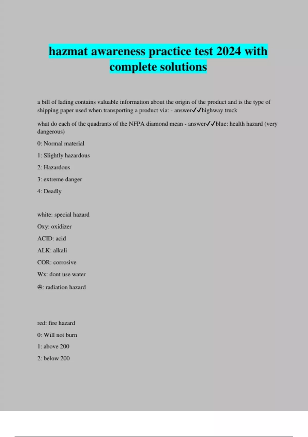 hazmat awareness practice test 2024 with complete solutions a bill of lading contains valuable information about the origin of the product and is the type of shipping paper used when transporting a product via: - answerhighway truck what do each of the quadrants of the NFPA diamond mean - answerblue: health hazard (very dangerous) 0: Normal material 1: Slightly hazardous 2: Hazardous 3: extreme danger 4: Deadly white: special hazard Oxy: oxidizer ACID: acid ALK: alkali COR: corrosive Wx: dont use water : radiation hazard red: fire hazard 0: Will not burn 1: above 200 2: below 200 3: below 100 4: below 73 yellow: Instability hazard 0: stable 1: unstable if heated 2: violent chemical change 3: shock and heat may detonate 4: may detonate The four-digit number appearing on a placard or an orange panel of a tank car is the: - answerUN product identification number Which of the package labels listed below indicates the highest radiation hazard? - answerradioactive yellow 3 for materials in hazard class 8 (corrosive), a DOT placard is required if the gross weight is in excess of: - answer1001 lb