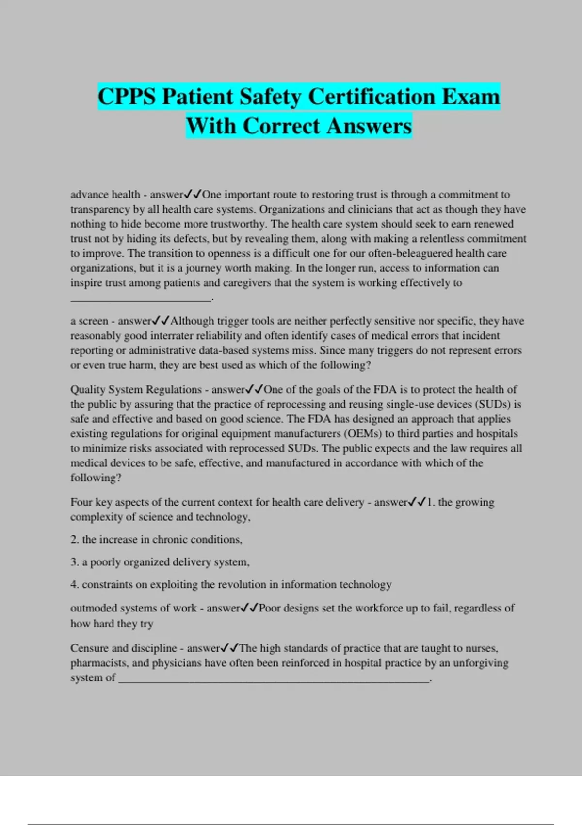 CPPS Patient Safety Certification Exam With Correct Answers advance health - answerOne important route to restoring trust is through a commitment to transparency by all health care systems. Organizations and clinicians that act as though they have nothing to hide become more trustworthy. The health care system should seek to earn renewed trust not by hiding its defects, but by revealing them, along with making a relentless commitment to improve. The transition to openness is a difficult one for our often-beleaguered health care organizations, but it is a journey worth making. In the longer run, access to information can inspire trust among patients and caregivers that the system is working effectively to ________________________. a screen - answerAlthough trigger tools are neither perfectly sensitive nor specific, they have reasonably good interrater reliability and often identify cases of medical errors that incident reporting or administrative data-based systems miss. Since many triggers do not represent errors or even true harm, they are best used as which of the following? Quality System Regulations - answerOne of the goals of the FDA is to protect the health of the public by assuring that the practice of reprocessing and reusing single-use devices (SUDs) is safe and effective and based on good science. The FDA has designed an approach that applies existing regulations for original equipment manufacturers (OEMs) to third parties and hospitals to minimize risks associated with reprocessed SUDs. The public expects and the law requires all medical devices to be safe, effective, and manufactured in accordance with which of the following? Four key aspects of the current context for health care delivery - answer1. the growing complexity of science and technology, 2. the increase in chronic conditions, 3. a poorly organized delivery system, 4. constraints on exploiting the revolution in information technology outmoded systems of work - answerPoor designs set the workforce up to fail, regardless of how hard they try Censure and discipline - answerThe high standards of practice that are taught to nurses, pharmacists, and physicians have often been reinforced in hospital practice by an unforgiving system o