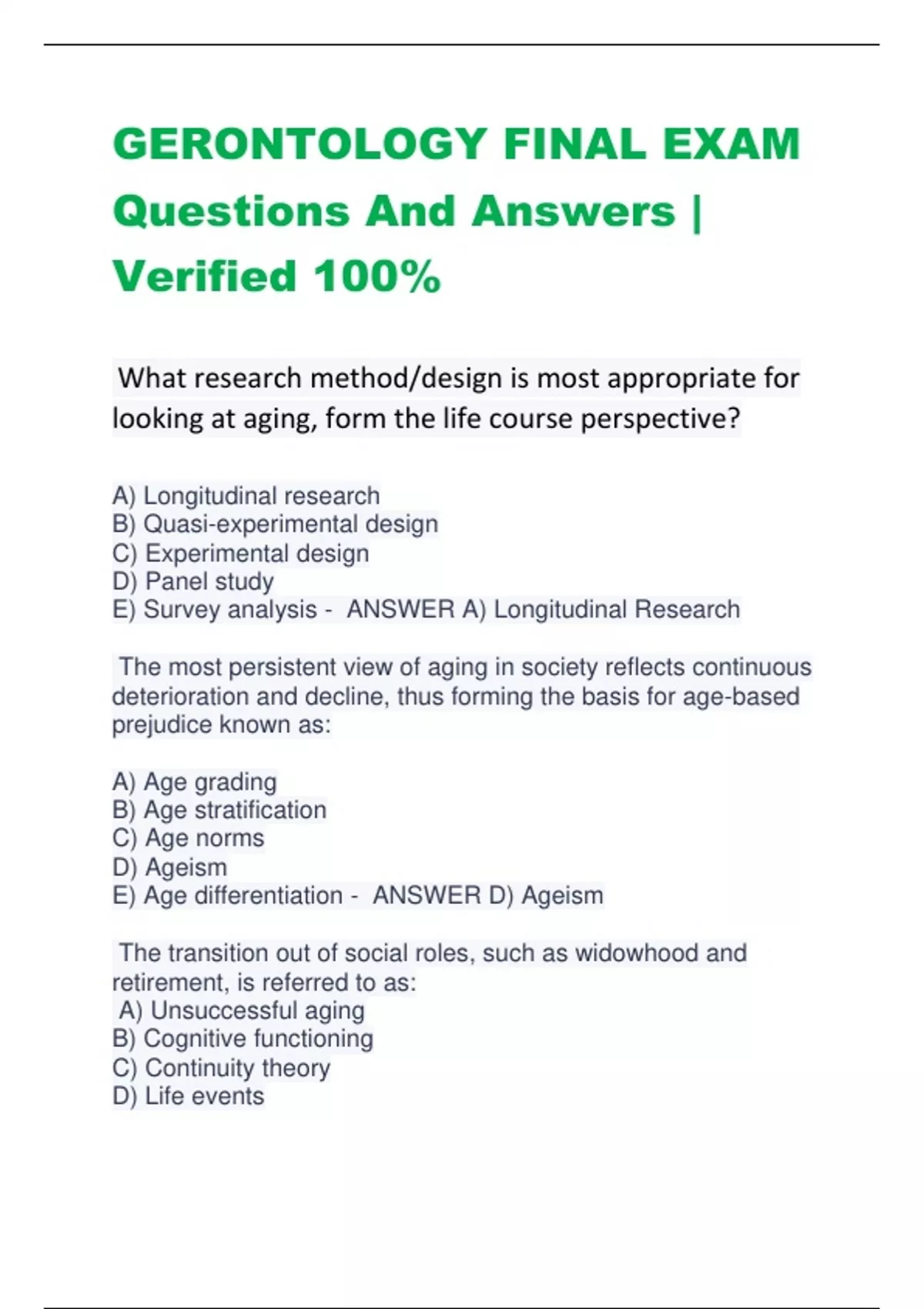 GERONTOLOGY FINAL EXAM Questions And Answers | Verified 100% What research method/design is most appropriate for looking at aging, form the life course perspective? A) Longitudinal research B) Quasi-experimental design C) Experimental design D) Panel study E) Survey analysis - ANSWER A) Longitudinal Research The most persistent view of aging in society reflects continuous deterioration and decline, thus forming the basis for age-based prejudice known as: A) Age grading B) Age stratification C) Age norms D) Ageism E) Age differentiation - ANSWER D) Ageism The transition out of social roles, such as widowhood and retirement, is referred to as: A) Unsuccessful aging B) Cognitive functioning C) Continuity theory D) Life events E) Role loss - ANSWER E) Role loss "Excess disability" involves experiencing more disability than necessary because the environment in which one lives is either too challenging or not challenging enough. A) True B) False - ANSWER A) True The "gray market" refers to the: A) Consumption of goods and services during one's retirement years B) Growing market for business comprised of those over age 50 C) Growing number of businesses that offer "senior discounts" D) Growing market for meaningful activities among people over age 50 E) None of the above - ANSWER B) Growing market for business comprised of those over age 50 How should people prepare for old age, according to de Beauvoir? A) Set aside money B) Choose the place where they will retire C) Acquire hobbies D) Live a committed, justified life E) All of the above - ANSWER D) Live a committed, justified life Older women tend to have higher levels of religious participation and belief than do men. A) True B) False - ANSWER A) True The main components of "successful aging" include which of the following? A) Avoiding disease and disability B) Maintaining mental and physical function C) Continuing engagement with life D) All of the above E) A and B above - ANSWER D) All of the above The Hayflick Limit refers to which of the following processes? A) HeLa cells continue to divide and grow. B) Normal human cells grown in tissue culture go through a limited number of cell divisions. C) Aging is regulated by glandular cells, perhaps of the hypothalamus, thymus, or pituitary gland. D) Waste products and other harmful substances build up in the cells. E) None of the above - ANSWER B) Normal human cells grown in tissue culture go through a limited number of cell divisions. Although cultural stereotypes suggest that women are more biologically fragile than men, the Gompertz law indicates that women and men are equally likely to die