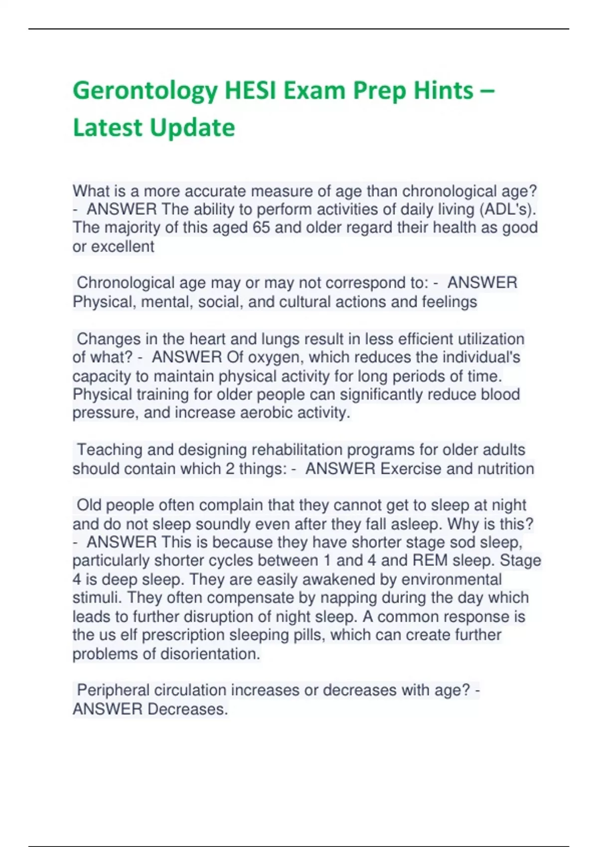Gerontology HESI Exam Prep Hints – Latest Update What is a more accurate measure of age than chronological age? - ANSWER The ability to perform activities of daily living (ADL's). The majority of this aged 65 and older regard their health as good or excellent Chronological age may or may not correspond to: - ANSWER Physical, mental, social, and cultural actions and feelings Changes in the heart and lungs result in less efficient utilization of what? - ANSWER Of oxygen, which reduces the individual's capacity to maintain physical activity for long periods of time. Physical training for older people can significantly reduce blood pressure, and increase aerobic activity. Teaching and designing rehabilitation programs for older adults should contain which 2 things: - ANSWER Exercise and nutrition Old people often complain that they cannot get to sleep at night and do not sleep soundly even after they fall asleep. Why is this? - ANSWER This is because they have shorter stage sod sleep, particularly shorter cycles between 1 and 4 and REM sleep. Stage 4 is deep sleep. They are easily awakened by environmental stimuli. They often compensate by napping during the day which leads to further disruption of night sleep. A common response is the us elf prescription sleeping pills, which can create further problems of disorientation. Peripheral circulation increases or decreases with age? - ANSWER Decreases. Why is regular assessment of the feet important in the elderly? - ANSWER It increase the opportunity to discoed and treat skin care problems early. These problems could become more serious d/t decreased circulation Differentiation of normal and pathologic causes for skin and hair conditions is essential: - ANSWER Ie seborrheic keratosis vs melanomas What places an older adult at risk for the development of pressure ulcers? - ANSWER Impaired mobility, impaired skin integrity, decreased peripheral circulation, and lack of physical activity What are ways to help prevent or decrease the occurrence of falls? - ANSWER Install adequate lighting, paint the edges of stairs a bright color, place a bell on any residents cats; cats move quickly and can get underfoot, wear proper footwear that supports the foot and contributes to balance, shoes made of non slippery materials Aging and systolic and diastolic blood pressures: increase or decrease with age? Physiology of blood pressure - ANSWER Both SBP and DBP increase with age, but systolic increase more than the DBP. Physiology of BP: expressed as a ratio of systolic to diastolic. Systolic refers to the level of the BP during the contraction phase; whereas diastolic refers to the stage when the chambers of the heart are filling with blood. Why are dysrhythmias particularly serious in older adults? - ANSWER Older adults cannot tolerate decreased C.O., which can result in syncope, falls, and transient ischemia attacks. Pulse may be rapid, slow, or irregular. Angina symptoms in older adults may be confused with what kind of symptoms? - ANSWER Gastrointestinal symptoms. Angina symptoms may be absent or they may be confused with GI symptoms With aging, what happens to the muscles that operate the lungs? - ANSWER The muscles that operate the lungs lose elasticity so that respiratory efficiency is reduced. Vital capacity- the amount of air brought into lungs at one time, decreases. Breathing may become more difficult after stre