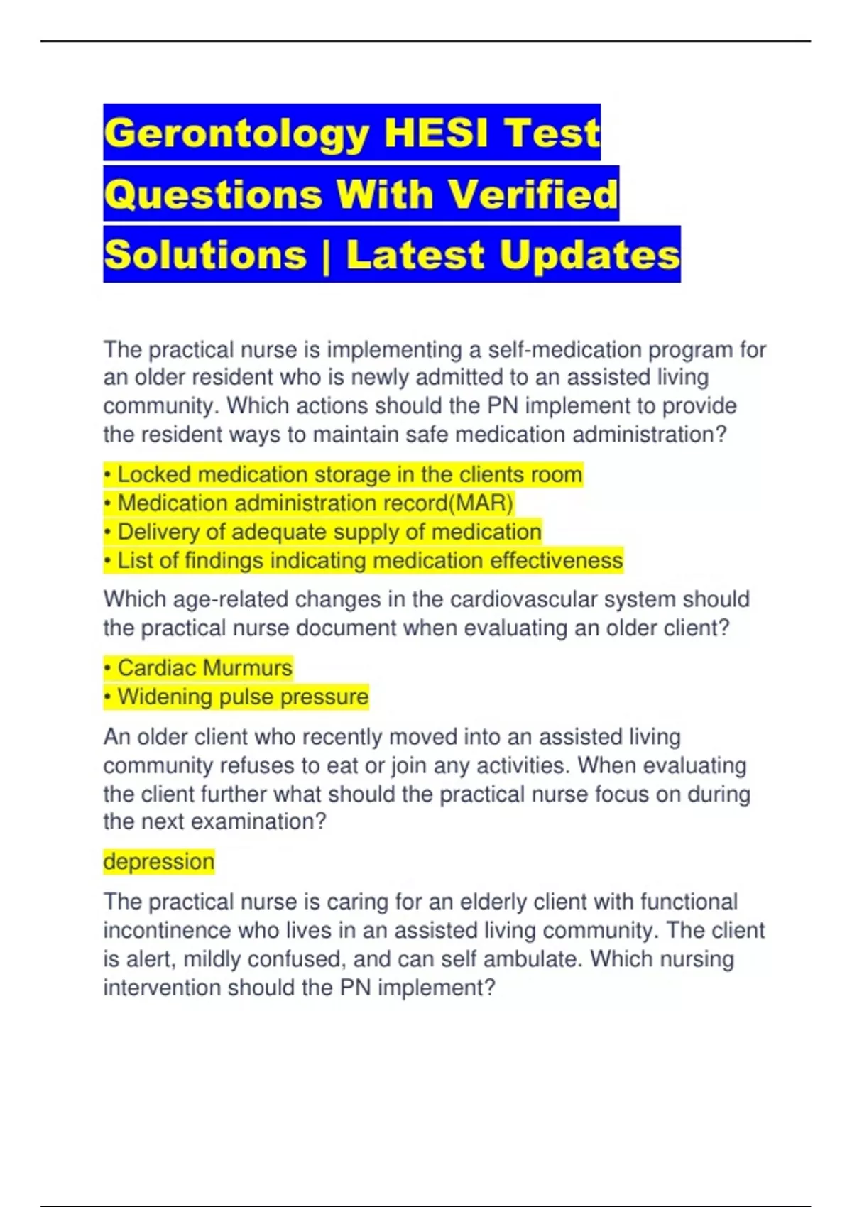 Gerontology HESI Test Questions With Verified Solutions | Latest Updates The practical nurse is implementing a self-medication program for an older resident who is newly admitted to an assisted living community. Which actions should the PN implement to provide the resident ways to maintain safe medication administration? • Locked medication storage in the clients room • Medication administration record(MAR) • Delivery of adequate supply of medication • List of findings indicating medication effectiveness Which age-related changes in the cardiovascular system should the practical nurse document when evaluating an older client? • Cardiac Murmurs • Widening pulse pressure An older client who recently moved into an assisted living community refuses to eat or join any activities. When evaluating the client further what should the practical nurse focus on during the next examination? depression The practical nurse is caring for an elderly client with functional incontinence who lives in an assisted living community. The client is alert, mildly confused, and can self ambulate. Which nursing intervention should the PN implement? • Offer assistance with toiling q2 hours. The healthcare provider prescribes a new medication, atrovastatin(Lipitor), for an older client who arrives at the clinic for an annual physical examination. What common side effect should the practical nurse advise the client to observe for with this medication? headaches The practical nurse is re-enforcing discharge instructions with the family of an older client who was recently admitted for an intestinal obstruction. Which statement indicates that the family understands the instructions? Report abdominal distention, constipation or any nausea and vomiting to the health care provider. An older male client asks the practical nurse how he can reduce his incidents of hemorrhoidal flare ups. What information should the PN offer the client to prevent rectal discomfort? • Increase fiber and liquids in diet to help prevent constipation and straining • Use a therapeutic cushion or frequent repositioning for periods of prolonged sitting. • Take frequent warm sitz baths and use non abrasive tissue that can tramatize tissues. • Establish bowel habits by scheduling time where the client is not rushed to defecate daily An older male client is seeking counseling about his recent sexual issues with his partner. What issue should the practical nurse explore in this discussion? • Certain medications may impact sexual function During the quarterly evaluations of the clients in the assisted living community, the practical nurse observes for findings of failure to thrive in the gerian population. Which findings should the PN document and report as manifestations related to failure to thrive? • Unintentional weight loss • Increased weakness • Increased amounts of sleep The practical nurse is reinforcing discharge instructions to the family of an older client with failure to thrive. What information should the PN include to prom