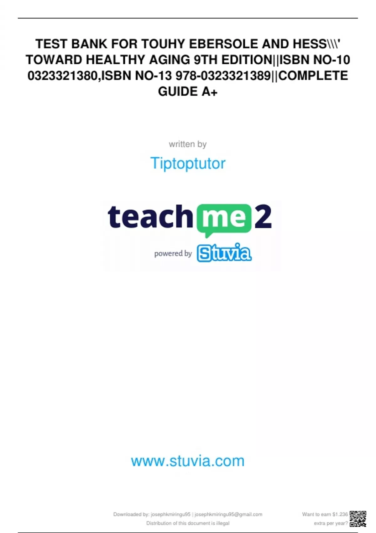 Test Bank for Ebersole & Hess' Toward Healthy Aging, 9th Edition by Theris A. Touhy ISBN: 9780323321389 | Complete Guide A+