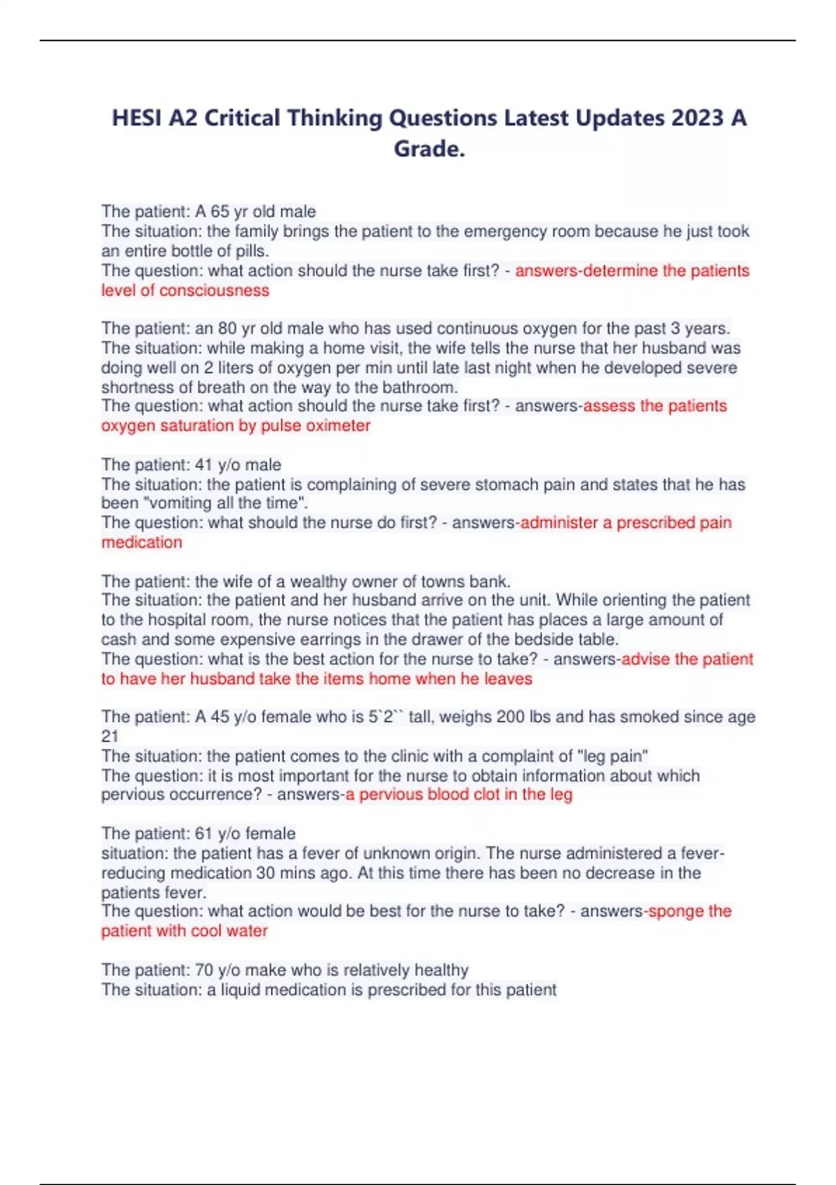 HESI A2 Critical Thinking Questions Latest Updates 2023 A Grade. The patient: A 65 yr old male The situation: the family brings the patient to the emergency room because he just took an entire bottle of pills. The question: what action should the nurse take first? - answers-determine the patients level of consciousness The patient: an 80 yr old male who has used continuous oxygen for the past 3 years. The situation: while making a home visit, the wife tells the nurse that her husband was doing well on 2 liters of oxygen per min until late last night when he developed severe shortness of breath on the way to the bathroom. The question: what action should the nurse take first? - answers-assess the patients oxygen saturation by pulse oximeter The patient: 41 y/o male The situation: the patient is complaining of severe stomach pain and states that he has been "vomiting all the time". The question: what should the nurse do first? - answers-administer a prescribed pain medication The patient: the wife of a wealthy owner of towns bank. The situation: the patient and her husband arrive on the unit. While orienting the patient to the hospital room, the nurse notices that the patient has places a large amount of cash and some expensive earrings in the drawer of the bedside table. The question: what is the best action for the nurse to take? - answers-advise the patient to have her husband take the items home when he leaves The patient: A 45 y/o female who is 5`2`` tall, weighs 200 lbs and has smoked since age 21 The situation: the patient comes to the clinic with a complaint of "leg pain" The question: it is most important for the nurse to obtain information about which pervious occurrence? - answers-a pervious blood clot in the leg The patient: 61 y/o female situation: the patient has a fever of unknown origin. The nurse administered a feverreducing medication 30 mins ago. At this time there has been no decrease in the patients fever. The question: what action would be best for the nurse to take? - answers-sponge the patient with cool water The patient: 70 y/o make who is relatively healthy The situation: a liquid medication is prescribed for this patient The question: prior to administering the prescribed medication, what intervention has the highest priority? - answers-determine if the patient is allergic to the medication the patient: 58 y/o female the situation: while the nurse is offering the patient her morning medication, she tells the nurse she does not recall ever taking a pill that was pink colored. The question: what should the nurse do in response to the patients comment? - answers-withhold the medication until the prescription is verified The patients: 1. 63 y/o with burn on the left lower leg who is complaining of pain. 2. a 45 y/o with pneumonia, complaining of shortness of breath 3. 31 y/o with abdominal pain who has just vomited blood. 4. 88 y/o who has right sided paralysis and wants to be helped to the bathroom immediately Situation: the nurse is caring for these patients The questions: who should the nurse see 1st? - answers-45 y/o with pneumonia, complaining of shortness of breath (ABCs- Airway, Breathing, Circulation) The patients 1. a 13 y/o female with a kidney infection who reports that there is "lots of blood in her urine". 2. 18 y/o male with acute alcohol poisoning who is seeing "bugs on the walls" 3. a 21 y/o female with inflammatory bowel disease who has soaked dressing 3 hrs after surgery 4. a 25 y/o male who is sobbing in his room after being told that he has testicular cancer Situation: the nurse is caring for these 4 patients Question: who should the nurse see first? - answers-the 21 y/o who is 3 hrs postoperative and has a soaked dressing Patients: 1. a 42 y/o with diabetes who is blind and is asking to get up and moved to a chair 2. a 88 y/o with lower body paralysis who wants to be turned in bed 3. a 17 y/o with asthma who smokes and has been in the bathroom for 30 mins 4. 55 y/o with cardiac disease who tells the nurse " get the tv fixed or i am leaving this place" Situation: the nurse is caring for these 4 patients The questions: which patient should the nurse see 1st? - answers-17 y/o with asthma and smokes and has been in the bathroom for 30 mins Patient: an elderly female accompanied by her middle aged son. Situation: the patient is being discharged after 15 day stay on medical unit, and the son offers a box of candy as a gesture of thanks for caring for his mother. Questions: what should the nurse do in response to the offer of this gift? - answerssincerely thank the son, and share the candy with all staff members on the unit Patient: 25 y/o female who has smoked since the age 12 Situation: the patient is complaint of "skipped heart beats". The question: which instruction is most important for the nurse to provide this patient? - answers-call for assistance if she feels weak or dizzy when getting out of bed Patient: a frail 88 y/o male who has recently become slightly confused. The situation: the nurse is making a home visit and assesses the safety features of the home environment. The questions: which suggestion would be most important for the nurse to provide the family? - answers-eliminate any throw rugs from the floor The patient: 55 y/o female with a family history of hypertension Situation: the patient is concerned about her health and states " i have have severe headaches for the last six month. I think I might have high blood pressure" The nurse determines the woman's bp is 138/86 (high normal). Question: what action would be best for the nurse to take? - answers-ask the patient about the frequency, timing and quality of her headaches The Patient: A 35-year-old female with a history of asthma. The Situation: The patient has been using a steroid inhaler because she is short of breath. However, she states that her shortness of breath is "no better." The Question: What is the most important information for the nurse to obtain? - an