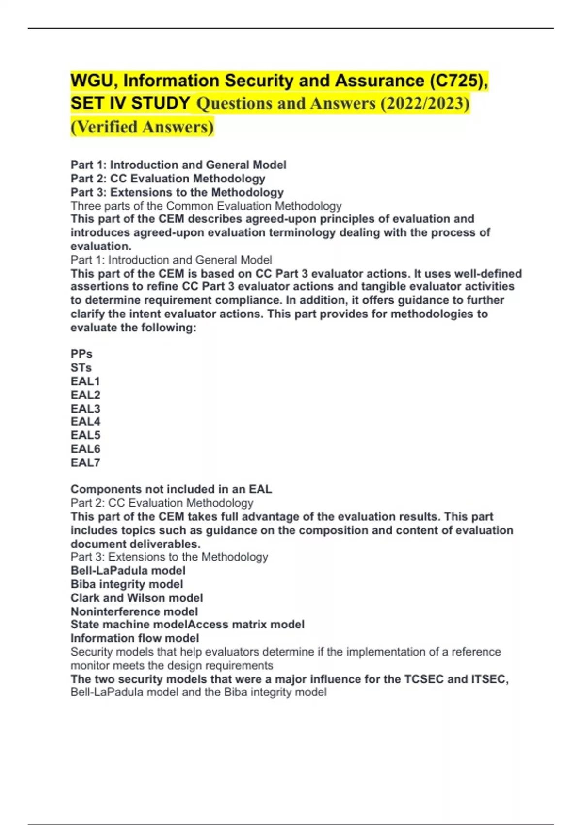 WGU, Information Security and Assurance (C725), SET IV STUDY Questions and Answers (2022/2023) (Verified Answers) Part 1: Introduction and General Model Part 2: CC Evaluation Methodology Part 3: Extensions to the Methodology Three parts of the Common Evaluation Methodology This part of the CEM describes agreed-upon principles of evaluation and introduces agreed-upon evaluation terminology dealing with the process of evaluation. Part 1: Introduction and General Model This part of the CEM is based on CC Part 3 evaluator actions. It uses well-defined assertions to refine CC Part 3 evaluator actions and tangible evaluator activities to determine requirement compliance. In addition, it offers guidance to further clarify the intent evaluator actions. This part provides for methodologies to evaluate the following: PPs STs EAL1 EAL2 EAL3 EAL4 EAL5 EAL6 EAL7 Components not included in an EAL Part 2: CC Evaluation Methodology This part of the CEM takes full advantage of the evaluation results. This part includes topics such as guidance on the composition and content of evaluation document deliverables. Part 3: Extensions to the Methodology Bell-LaPadula model Biba integrity model Clark and Wilson model Noninterference model State machine modelAccess matrix model Information flow model Security models that help evaluators determine if the implementation of a reference monitor meets the design requirements The two security models that were a major influence for the TCSEC and ITSEC, Bell-LaPadula model and the Biba integrity model Formed in the 1970's, a formal security model that describes a set of access control rules. A subjects access to an object is allowed or disallowed by comparing the objects security classification with the subjects security clearance. It is intended to preserve the principle of least privilege. It is a formal description of allowable paths of information flow in a secure system and defines security requirements for systems handling data at different sensitivity levels. The model defines a secure state and access between subjects and objects in accordance with specific security policy. Bell-LaPadula Model The Biba model covers integrity levels, which are analogs to the sensitivity levels from the Bell-LaPadula model. Integrity levels cover inappropriate modification of data and prevent unauthorized users from making modifications to resources and data. This security model uses a read-up, write-down approach. Subjects cannot read objects of lesser integrity and cannot write to objects of higher integrity. Think of CIA analysts and the information they need to perform their duties. Under this model, an analyst with Top Secret clearance can see only information that's labeled as Top Secret with respect to integrity (confirmed by multiple sources, and so forth); likewise, this analyst can contribute information only at his or her clearance level. People with higher clearances are not "poisoned" with data from a lower level of integrity and cannot poison those with clearances higher than theirs. Biba Integrity Model A security model that Proposes "well formed transactions." It requires mathematical proof that steps are performed in order exactly as they are listed, authenticates the individuals who perform the steps, and defines separation of duties. Clark and Wilson model A security model that covers ways to prevent subjects operating in one domain from affecting each other in violation of security policy. Covers ways to prevent subjects operating in one domain from affecting each other in violation of security policy. A security model that acts as an abstract mathematical model consisting of state variables and transition functions. State machine mode A security model that acts as a state machine model for a discretionary access control environment. Access matrix model A security model that simplifies analysis of covert channels. A covert channel is a communication channel that allows two cooperating processes of different security levels (one higher than the other) to transfer information in a way that violates a system's security policy. Information flow model Which of the following terms best describes the primary concern of the Biba security model? A. Confidentiality B. Reliability C. Availability D. Integrity D. Integrity Explanation: The Biba model covers integrity levels, which are analogs to the sensitivity levels from the Bell-LaPadula model. Integrity levels cover inappropriate modification of data and prevent unauthorized users from making modifications to resources and data/ Which of the following events is considered a man-made disaster? A. Earthquake B. Tornado C. Flooding caused by a broken water main D. Labor walkout Labor walkout Which of the following statements is not true about the BCP and DRP? A. Both plans deal with security infractions after they occur. B. Both plans describe preventative, not reactive, security procedures. C. The BCP and DRP share the goal of maintaining "business as usual" activities. D. They belong to the same domain of the Common Body of Knowledge. B. Both plans describe preventative, not reactive, security procedures. Explanation: The business continuity plan (BCP) describes the critical processes, procedures, and personnel that must be protected in the event of an emergency (preventative) and The disaster recovery plan (DRP) describes the exact steps and procedures personnel in key departments, specifically the IT department, must follow to recover critical business systems in the event of a disaster that causes the loss of access to systems required for business operations (reactive). Which of the following is the number one priority of disaster response? A. Hardware protection B. Software protection C. Transaction processing D. Personnel safety D. Personnel safety Involves reviewing the risks to organizational procedures Business continuity plan Focuses on policies and procedures that make a disruptive event have a little impact o