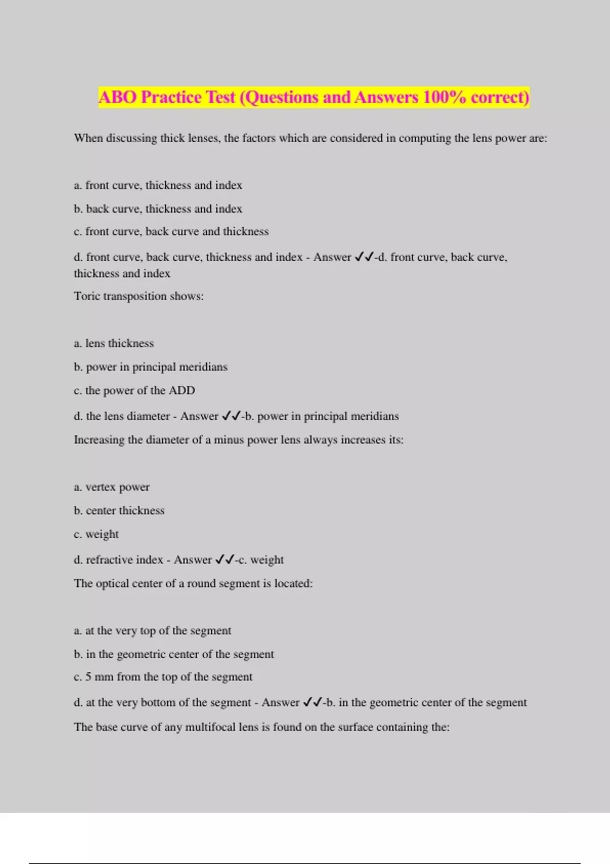 ABO Practice Test (Questions and Answers 100% correct) When discussing thick lenses, the factors which are considered in computing the lens power are: a. front curve, thickness and index b. back curve, thickness and index c. front curve, back curve and thickness d. front curve, back curve, thickness and index - Answer ️️ -d. front curve, back curve, thickness and index Toric transposition shows: a. lens thickness b. power in principal meridians c. the power of the ADD d. the lens diameter - Answer ️️ -b. power in principal meridians Increasing the diameter of a minus power lens always increases its: a. vertex power b. center thickness c. weight d. refractive index - Answer ️️ -c. weight The optical center of a round segment is located: a. at the very top of the segment b. in the geometric center of the segment c. 5 mm from the top of the segment d. at the very bottom of the segment - Answer ️️ -b. in the geometric center of the segment The base curve of any multifocal lens is found on the surface containing the: a. cross curve b. cylinder surface c. segment d. ocular curve - Answer ️️ -c. segment Normal slab-off (bicentric grind) is ground on the lens whose vertical meridian has the: a. strongest curves b. most plus power c. least plus power d. least minus power - Answer ️️ -c. least plus power The refractive error indicated by the Rx +1.75 -2.75 x 090 is: a. compound hyperopic astigmatism b. compound myopic astigmatism c. simple myopic astigmatism d. mixed astigmatism - Answer ️️ -d. mixed astigmatism Tempering a lens by heat treating results in a lens being: a. less resistant to impact b. more resistant to impact c. more resistant to surface scratching d. impossible to break - Answer ️️ -b. more resistant to impact A slab-off lens is for the correction of: a. astigmatic errors b. excessive weight of lens c. excessive prism imbalance at the reading level d. exotropia - Answer ️️ -c. excessive prism imbalance at the reading level Chem-tempering makes a glass lens more impact resistant by placing the lens in a potassium nitrate bath. The lens undergoes a process known as: a. ion exchange b. iron oxide activation c. silver halide transfer d. thermal bleaching - Answer ️️ -a. ion exchange Which wavelengths of light have been indicated as possible contributors to the onset of cataracts? a. 400-520 nm b. 520-635 nm c. 350-400 nm d. 635-750 nm - Answer ️️ -c. 350-400 nm When the lenses are laid out and marked for cutting and edging, the lenses are usually decentered so as to correspond to the patient's pupillary distance after lenses are inserted. This is done for the following reason: a. to avoid unwanted prism b. for cosmetic effect c. to use off-center lenses d. to avoid thick edges on the nasal side - Answer ️️ -a. to avoid unwanted prism Light falling on the front surface of a spectacle lens is: a. partially reflected, partially absorbed and the remainder refracted b. partially reflected and the remainder refracted c. partially absorbed and the remainder refracted d. totally refracted - Answer ️️ -a. partially reflected, partially absorbed and the remainder refracted A concave mirror: a. can focus parallel incident rays to form a real image b. can focus parallel incident rays to form a virtual image c. always produces inverted images of real objects d. produces virtual images smaller than the real object - Answer ️️ -a. can focus parallel incident rays to form a real image White light is broken into its component colors when it is: a. diffracted b. refracted c. reflected d. diffracted or refracted - Answer ️️ -d. diffracted or refracted To the viewer; the image seen in a plane mirror appears to be: a. inverted b. one-half as large as the object c. twice as large as the object d. as far behind the mirror as the object is in front of it - Answer ️️ -d. as far behind the mirror as the object is in front of it The velocity of light is the lea