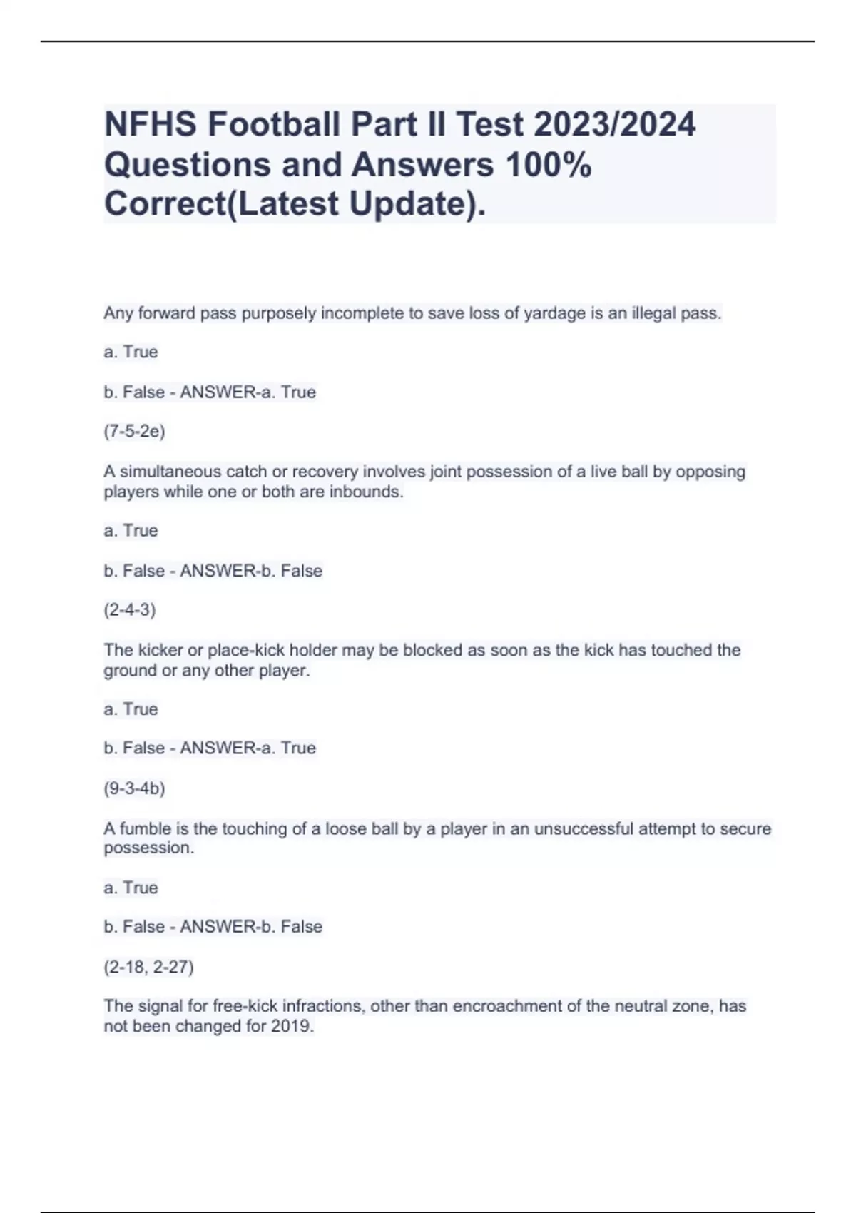 Any forward pass purposely incomplete to save loss of yardage is an illegal pass. a. True b. False - ANSWER-a. True (7-5-2e) A simultaneous catch or recovery involves joint possession of a live ball by opposing players while one or both are inbounds. a. True b. False - ANSWER-b. False (2-4-3) The kicker or place-kick holder may be blocked as soon as the kick has touched the ground or any other player. a. True b. False - ANSWER-a. True (9-3-4b) A fumble is the touching of a loose ball by a player in an unsuccessful attempt to secure possession. a. True b. False - ANSWER-b. False (2-18, 2-27) The signal for free-kick infractions, other than encroachment of the neutral zone, has not been changed for 2019. a. True b. False - ANSWER-a. True (6-1-3b Penalty, 6-1-4 Penalty, NFHS Official Football Signals) Receivers may legally apply sticky foreign material on their hands as an aid in catching the ball. a. True b. False - ANSWER-b. False (1-5-3a(2)) It is legal to grasp the opponent's chin strap. a. True b. False - ANSWER-b. False (9-4-3h) The game officials are responsible for ensuring that there is a three-minute warm-up period posted on the game clock and that the game clock starts immediately after the halftime intermission expires. a. True b. False - ANSWER-a. True (Table 3-1) A catch is the act of establishing player possession of a live ball which is in flight, and first contacting the ground inbounds while maintaining possession of the ball. a. True b. False - ANSWER-a. True (2-4-1)