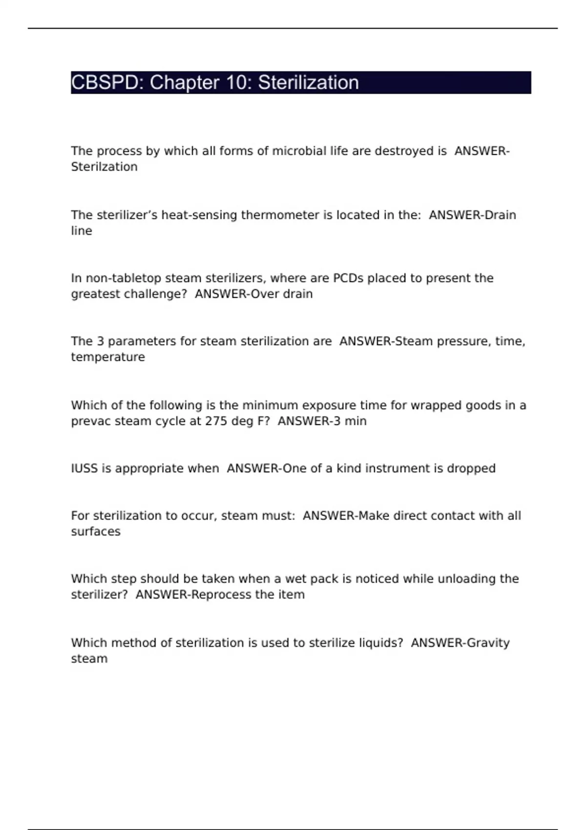 CBSPD: Chapter 10: Sterilization|Questions with 100% Correct Answers | Updated 2024 | Guaranteed A+