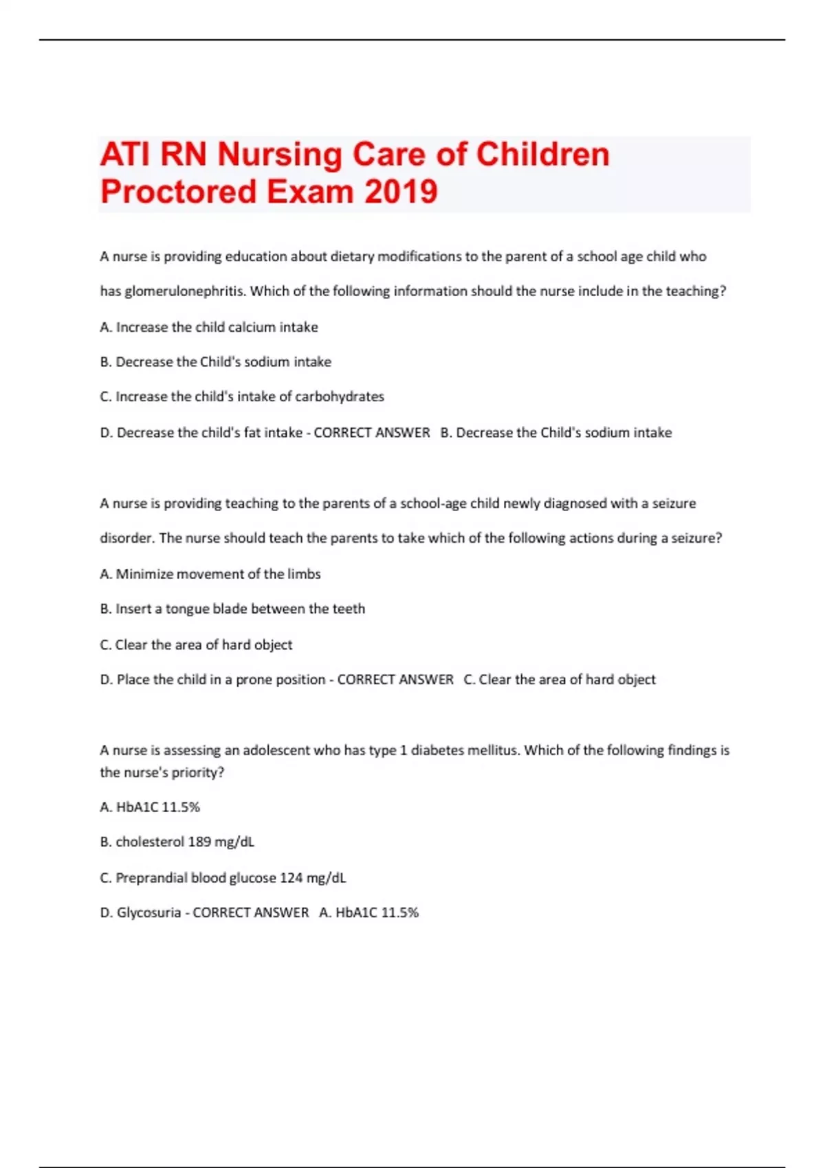 ATI RN Nursing Care of Children Proctored Exam 2019