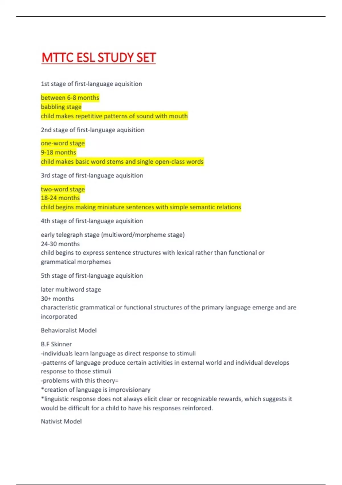 4th stage of first-language aquisition early telegraph stage (multiword/morpheme stage) 24-30 months child begins to express sentence structures with lexical rather than functional or grammatical morphemes 5th stage of first-language aquisition later multiword stage 30+ months characteristic grammatical or functional structures of the primary language emerge and are incorporated Behavioralist Model B.F Skinner -individuals learn language as direct response to stimuli -patterns of language produce certain activities in external world and individual develops response to those stimuli -problems with this theory= *creation of language is improvisionary *linguistic response does not always elicit clear or recognizable rewards, which suggests it would be difficult for a child to have his responses reinforced. Nativist Mode