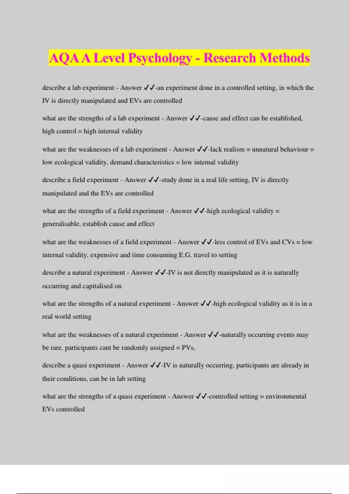 AQA A Level Psychology - Research Methods describe a lab experiment - Answer ️️ -an experiment done in a controlled setting, in which the IV is directly manipulated and EVs are controlled what are the strengths of a lab experiment - Answer ️️ -cause and effect can be established, high control = high internal validity what are the weaknesses of a lab experiment - Answer ️️ -lack realism = unnatural behaviour = low ecological validity, demand characteristics = low internal validity describe a field experiment - Answer ️️ -study done in a real life setting, IV is directly manipulated and the EVs are controlled what are the strengths of a field experiment - Answer ️️ -high ecological validity = generalisable, establish cause and effect what are the weaknesses of a field experiment - Answer ️️ -less control of EVs and CVs = low internal validity, expensive and time consuming E.G. travel to setting describe a natural experiment - Answer ️️ -IV is not directly manipulated as it is naturally occurring and capitalised on what are the strengths of a natural experiment - Answer ️️ -high ecological validity as it is in a real world setting what are the weaknesses of a natural experiment - Answer ️️ -naturally occurring events may be rare, participants cant be randomly assigned = PVs, describe a quasi experiment - Answer ️️ -IV is naturally occurring, participants are already in their conditions, can be in lab setting what are the strengths of a quasi experiment - Answer ️️ -controlled setting = environmental EVs controlled what are the weaknesses of a quasi experiment - Answer ️️ -participants are not randomly assigned = participants EVs are not controlled Describe repeated measures design - Answer ️️ -same participants in each condition what are the strengths of a repeated measures design - Answer ️️ -PVs are kept consistent, fewer participants are needed = cheap what are the weaknesses of a repeated measures design - Answer ️️ -order effects may be an issue. demand characteristics describe an independent groups design - Answer ️️ -different participants in each condition what are the strengths of an independant groups design - Answer ️️ -reduced order effects, reduced demand characteristics what are the weaknesses of an independant groups design - Answer ️️ -PVs, more participants needed = expensive describe a matched pairs design - Answer ️️ -different but similar participants in each condition. participants are matched on relevant PVs affective the IV and then randomly assigned to each condition. what are the strengths of a matched pairs design - Answer ️️ -PVs are kept more constant than IGD, order effects and demand characteristics are decreased what are the weaknesses of a matched pairs design - Answer ️️ -PVs never perfectly matched, time consuming and difficult and more participants needed = expensive define an open question - Answer ️️ -response given in own words what are the strengths of open questions - Answer ️️ -rich data is gained, increase in validity of conclusions as participants done have to pick best fitting answer what is the weaknesses of open questions - Answer ️️ -qualitative data is produced which decreases the chance for objective analysis