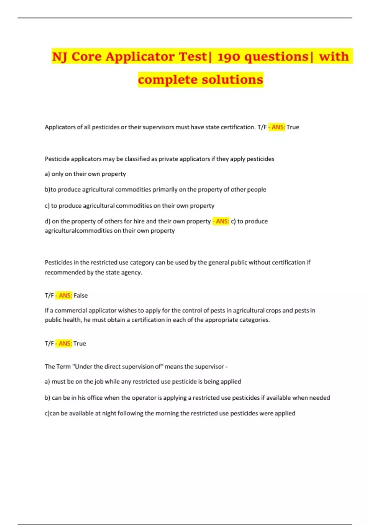 NJ Core Applicator Test| 190 questions| with complete solutions Applicators of all pesticides or their supervisors must have state certification. T/F - ANS: True Pesticide applicators may be classified as private applicators if they apply pesticides a)only on their own property b)to produce agricultural commodities primarily on the property of other people c)to produce agricultural commodities on their own property d)on the property of others for hire and their own property - ANS: c) to produce agricultural commodities on their own property Pesticides in the restricted use category can be used by the general public without certification if recommended by the state agency. T/F - ANS: False If a commercial applicator wishes to apply for the control of pests in agricultural crops and pests in public health, he must obtain a certification in each of the appropriate categories. T/F - ANS: True