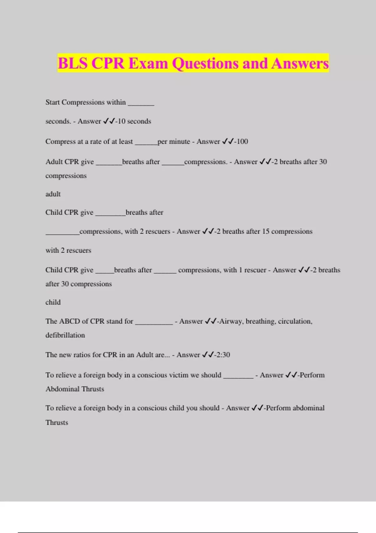 BLS CPR Exam Questions and Answers Start Compressions within _______ seconds. - Answer ️️ -10 seconds Compress at a rate of at least ______per minute - Answer ️️ -100 Adult CPR give _______breaths after ______compressions. - Answer ️️ -2 breaths after 30 compressions adult Child CPR give ________breaths after _________compressions, with 2 rescuers - Answer ️️ -2 breaths after 15 compressions with 2 rescuers Child CPR give _____breaths after ______ compressions, with 1 rescuer - Answer ️️ -2 breaths after 30 compressions child The ABCD of CPR stand for __________ - Answer ️️ -Airway, breathing, circulation, defibrillation The new ratios for CPR in an Adult are... - Answer ️️ -2:30 To relieve a foreign body in a conscious victim we should ________ - Answer ️️ -Perform Abdominal Thrusts To relieve a foreign body in a conscious child you should - Answer ️️ -Perform abdominal Thrusts